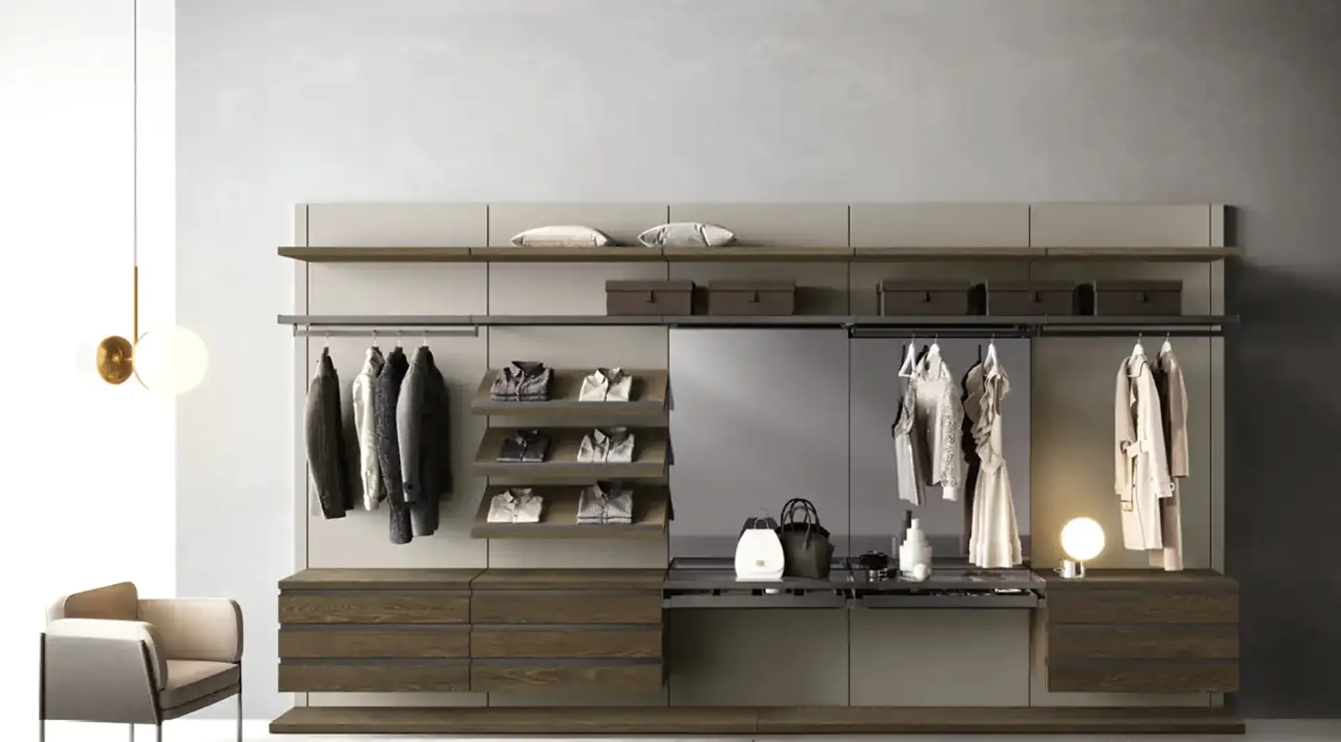 La cabina armadio Gemini G222, un'innovazione della collezione Omnia di Moretti Compact Giorno Notte, è concepita per massimizzare lo spazio e l'estetica della camera da letto. Il suo design integrato include un avanzato sistema di illuminazione, ottimizzando la visibilità e l'atmosfera. La struttura a cremagliera garantisce un'elevata modularità, offrendo piena libertà di personalizzazione con elementi che bilanciano linee tradizionali e soluzioni tecniche contemporanee. Il modello G222 si distingue per i pannelli posteriori in laccato opaco Perla, ripiani e accessori in Rovere Fiammato, con dettagli in alluminio Metal Gray e uno specchio Fumè, evidenziando una meticolosa selezione di materiali e finiture. Per un'integrazione ottimale nell'ambiente domestico, la configurazione è studiabile con soluzioni personalizzate.