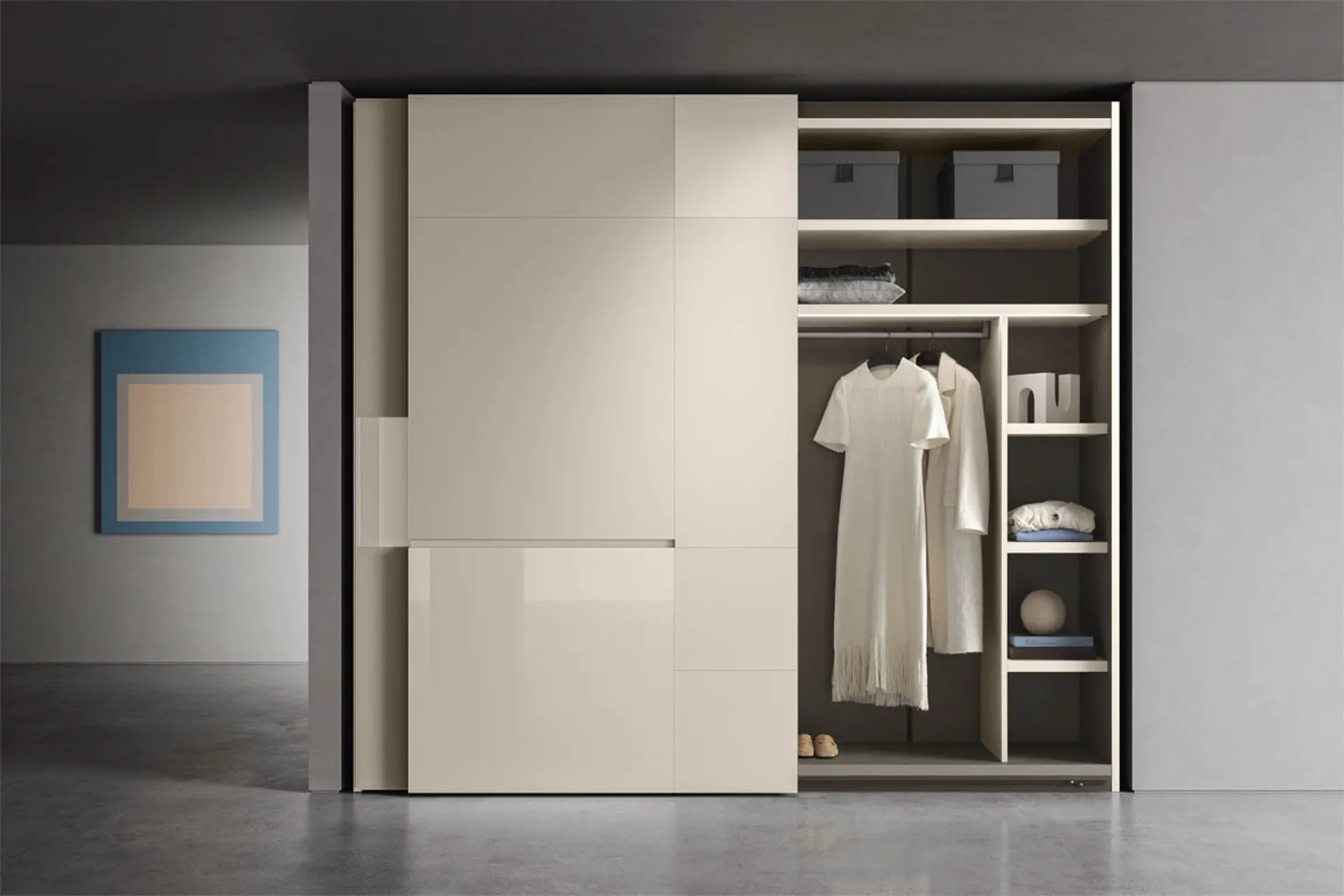 L'armadio CREA di Pianca incarna un design d'avanguardia, caratterizzato da un'estetica raffinata e distintiva. Le sue ante, disponibili sia nella configurazione scorrevole che complanare, sono impreziosite da un motivo geometrico dinamico, che alterna superfici in vetro laccato, sia lucide che opache, creando un effetto visivo di grande impatto, ispirato all'arte contemporanea. La maniglia integrata, un elemento grafico orizzontale, è sapientemente ricavata all'interno delle ante e offre opzioni di finitura in laccato opaco o diverse essenze lignee, consentendo un'elevata personalizzazione estetica e funzionale. La scelta dei materiali, che include Vetro Laccato, Vetro Laccato Metallico, Laccato Metallico (maniglia), Laccato Opaco (maniglia), Frassino Lino (essenza), Frassino Miele (essenza), Frassino Antracite (essenza), Frassino Nero (essenza), garantisce durabilità e un'integrazione armonica in ambienti moderni. Questo sistema d'arredo è progettato per offrire massima modularità e personalizzazione, rispondendo alle più esigenti necessità stilistiche e funzionali.
