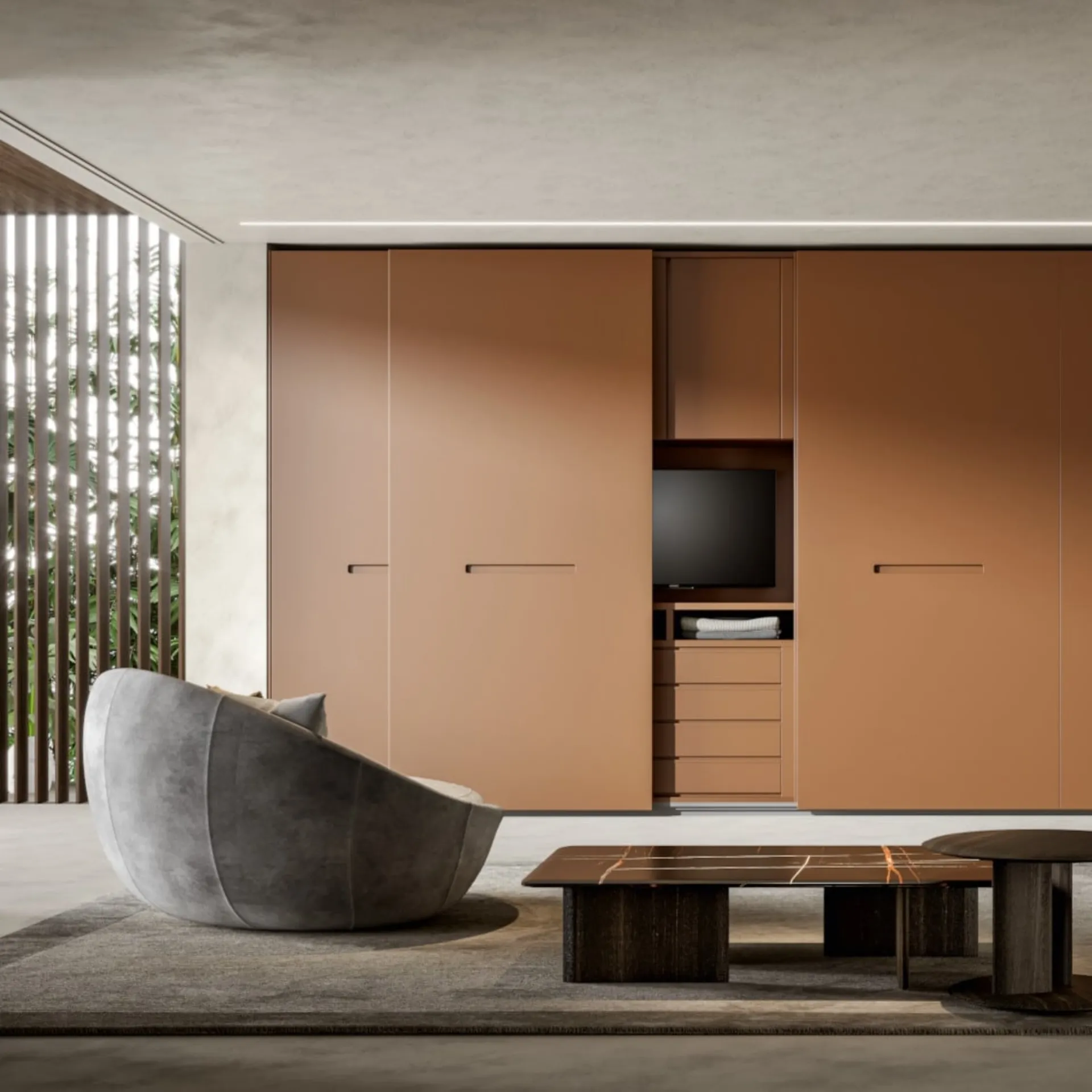 Per ammobiliare alla perfezione una stanza funzionale ed esteticamente gradevole, opta per le più esclusive soluzioni dei migliori brand, letti, armadi e comodini di alto contenuto estetico. Contattaci e scopri di più sulla nostra serie di Arredamento Casa: avrai la possibilità di ultimare la camera da letto usufruendo di una diversificata offerta di mobili contenitori moderni, come l'armadio in laccato opaco nell'immagine. Armadio con ante complanari Plana Liscia Terra Bruciata di Veneran: compila il form per ricevere info di ogni sorta e consigli per ammobiliare la camera che hai sempre voluto. Gli Armadi su misura con ante scorrevoli sono componenti immancabili in camera, per renderla ben arredata, funzionale e completa di tutto.