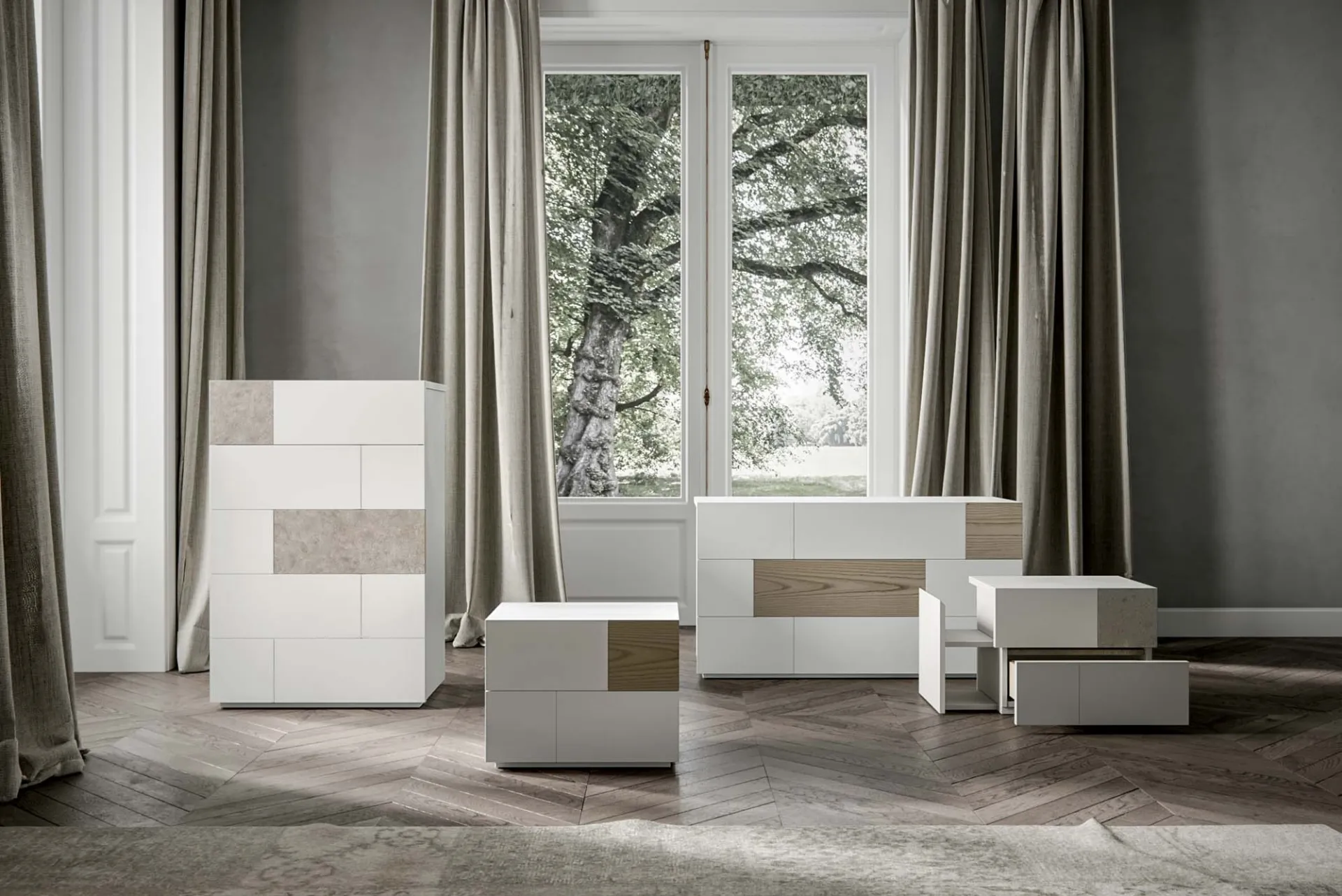 La zona notte include anche i Comodini: mobili per contenere indispensabili che danno modo di sistemare oggetti e potere ususfruire di piani di appoggio multiuso. Gruppo Notte Alvin di Veneran: contattaci e ottieni informazioni sulle nostre proposte d'arredo e arreda la camera come l'avevi immaginata. Con i nostri gruppi notte moderni della marca Veneran, specialista dell’Arredamento Casa per la zona notte, potrai ricreare la camera che hai sempre desiderato. Valorizza i tuoi spazi scegliendo composizioni di mobili coordinati o ricrea inediti accostamenti di stile e cromie grazie al catalogo di mobili e complementi per la zona notte che proponiamo, come il modello in laccato opaco visibile in foto, anche realizzabili su misura per te.