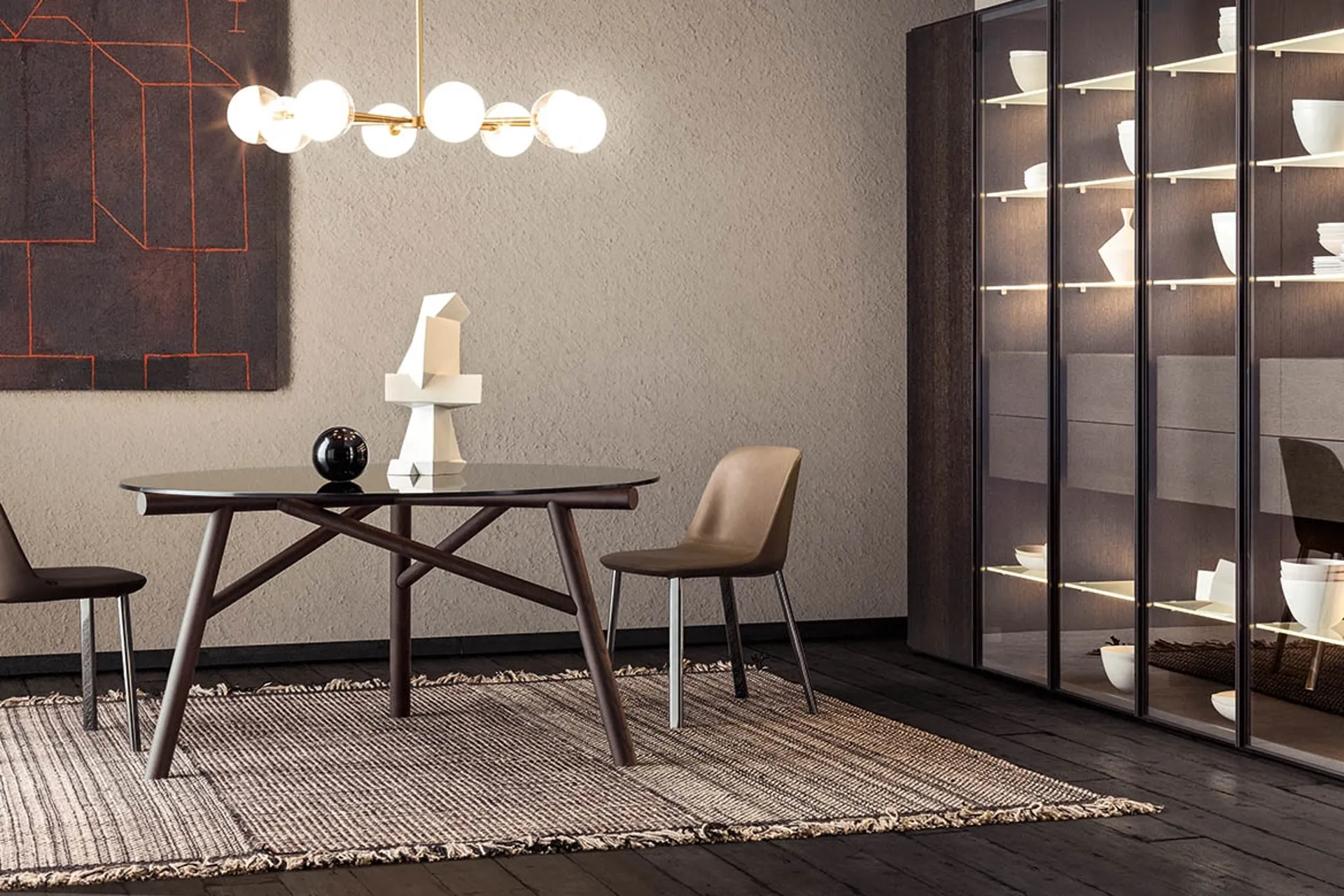 La libreria Spazioteca Vetro di Pianca si configura come un sistema modulare avanzato, ideato per offrire massima personalizzazione e funzionalità negli ambienti living. La sua struttura è basata su fianchi, ripiani, schiene e divisori componibili, che permettono di creare configurazioni su misura con un'attenzione meticolosa all'ordine e alla proporzione. Il design è caratterizzato da leggerezza visiva e dinamismo, adattandosi con versatilità a diverse esigenze progettuali. Un elemento distintivo della versione 'Vetro' è l'integrazione di ante a ribalta realizzate in vetro trasparente, impreziosite da una cornice serigrafata di colore nero, che non solo amplificano le possibilità espositive ma consentono anche l'integrazione discreta di aree home office. Il sistema garantisce vani interni liberi da fori o ferramenta a vista e un passo modulare di 1 cm, enfatizzando la pulizia estetica e la precisione costruttiva. Questa soluzione rappresenta un'eccellenza nell'ingegneria del mobile, offrendo un'architettura d'interni di elevata qualità e durata.
