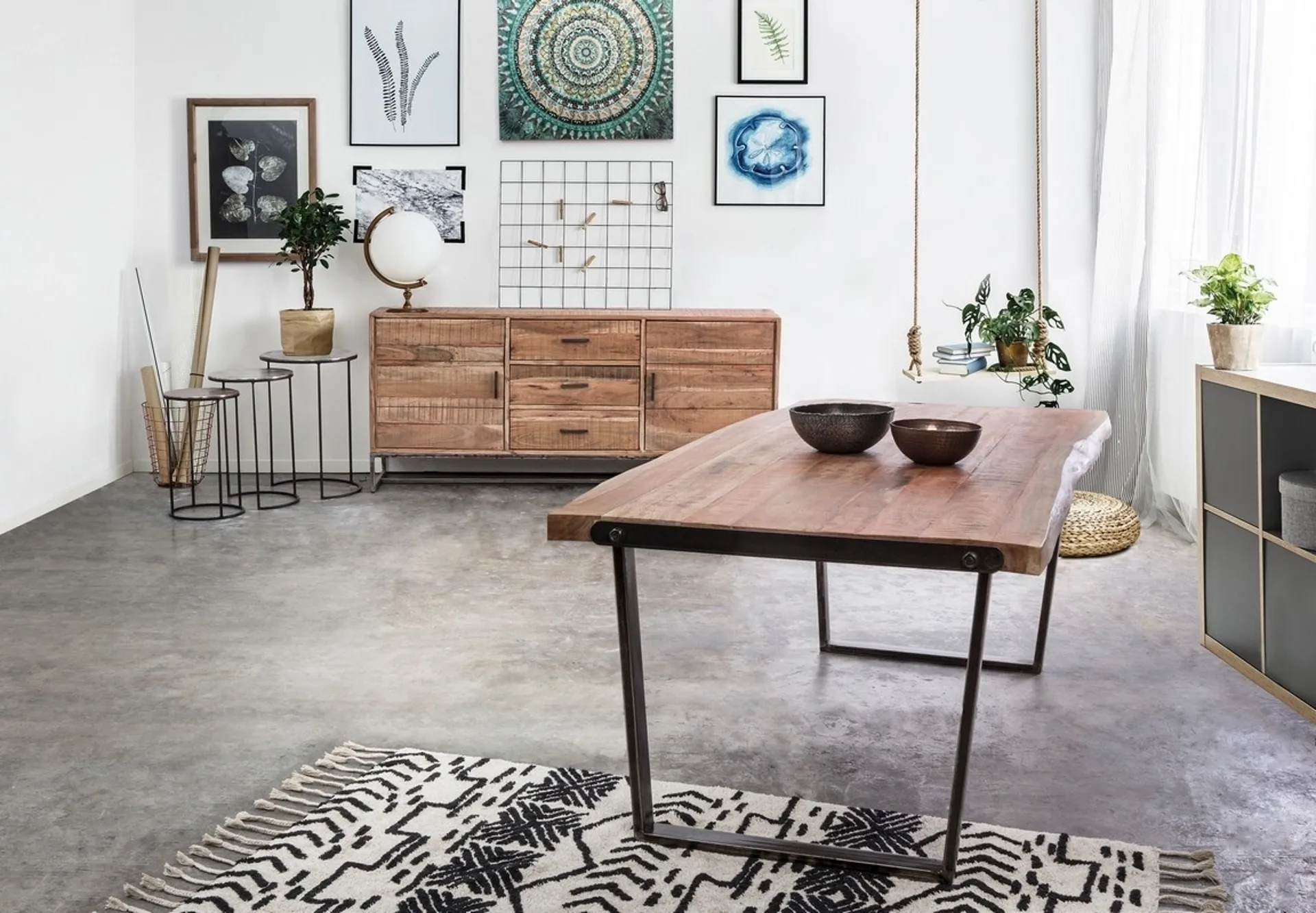 Il tavolo Elmer, un'espressione raffinata del design industriale, è caratterizzato da un piano in legno di acacia attentamente lavorato a mano. Questa peculiare manifattura assicura che ogni esemplare sia irripetibile, con venature e conformazioni che riflettono l'autenticità delle sezioni originali del tronco. La superficie è protetta da una finitura acrilica di alta qualità, mentre le gambe sono realizzate in robusto acciaio verniciato a polvere epossidica, garantendo stabilità e durabilità nel tempo. Si evidenzia che le dimensioni e le forme del piano sono indicative, data la natura artigianale del processo produttivo, rendendo ogni pezzo unico e distintivo. Questo approccio garantisce una soluzione d'arredo che coniuga un design distintivo con una funzionalità senza compromessi, offrendo un prodotto di alta qualità e durevole nel tempo.