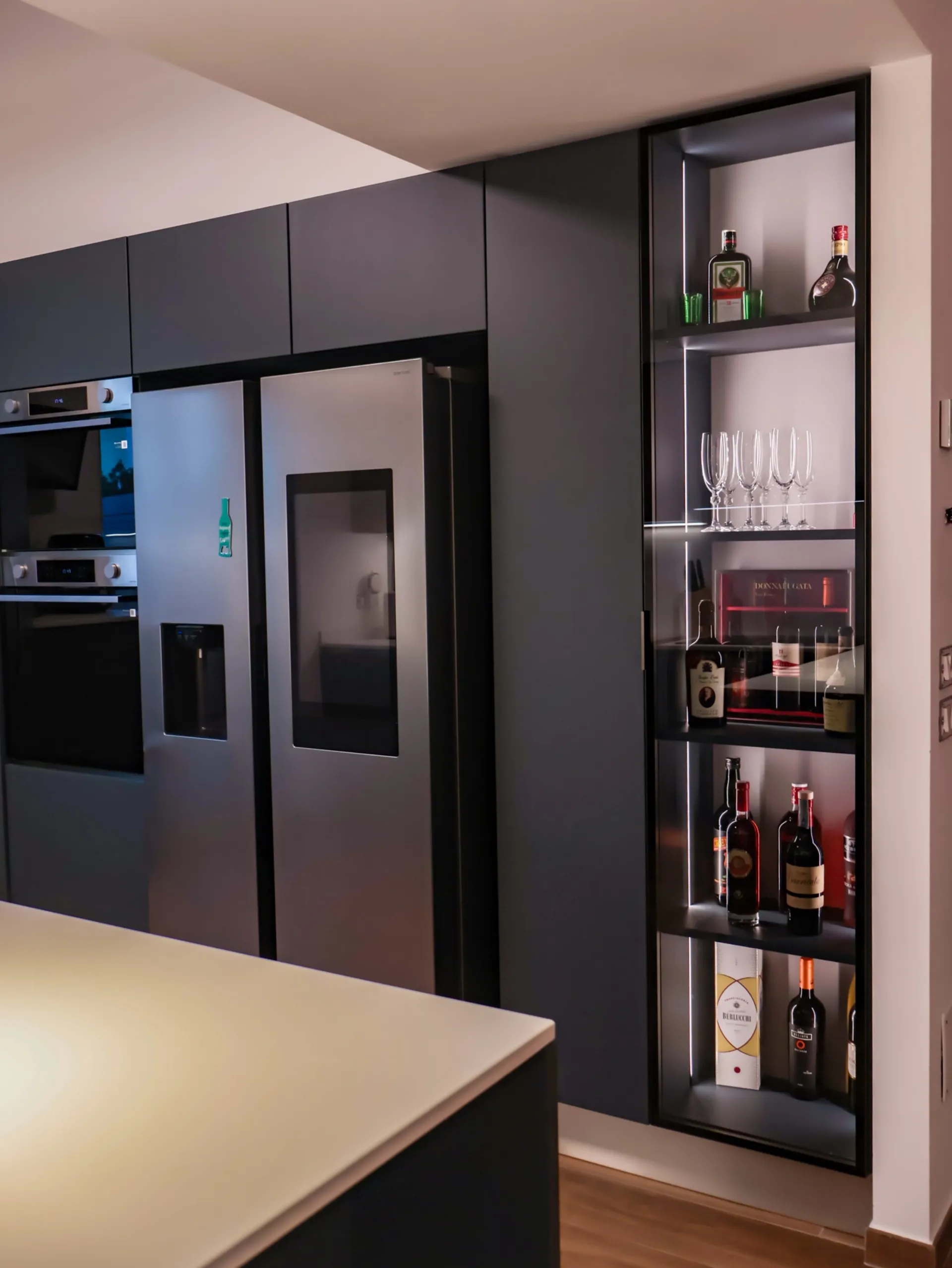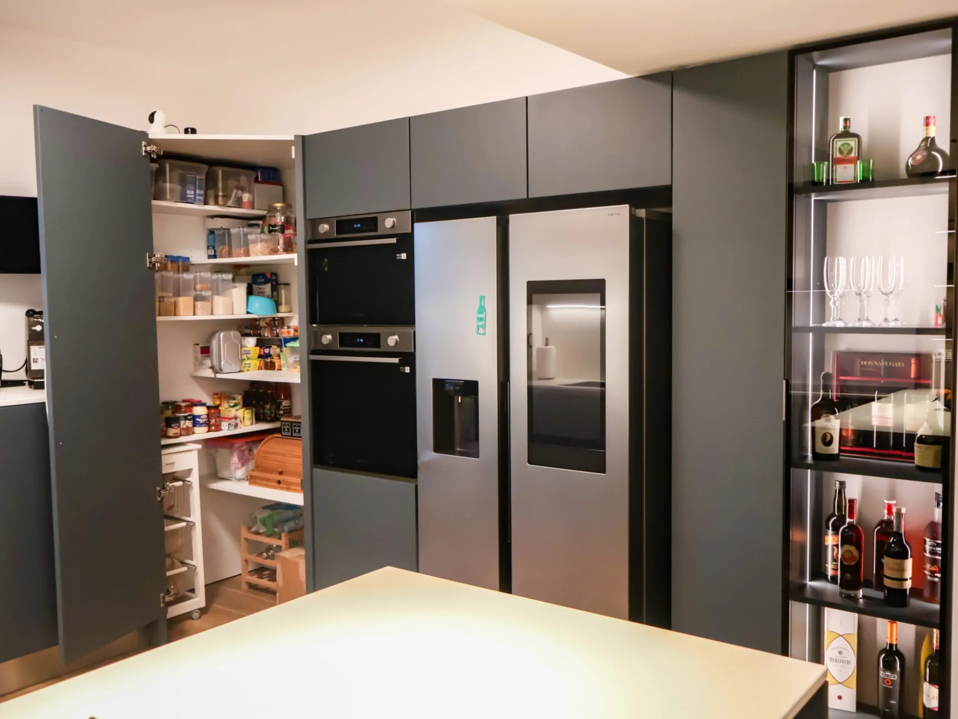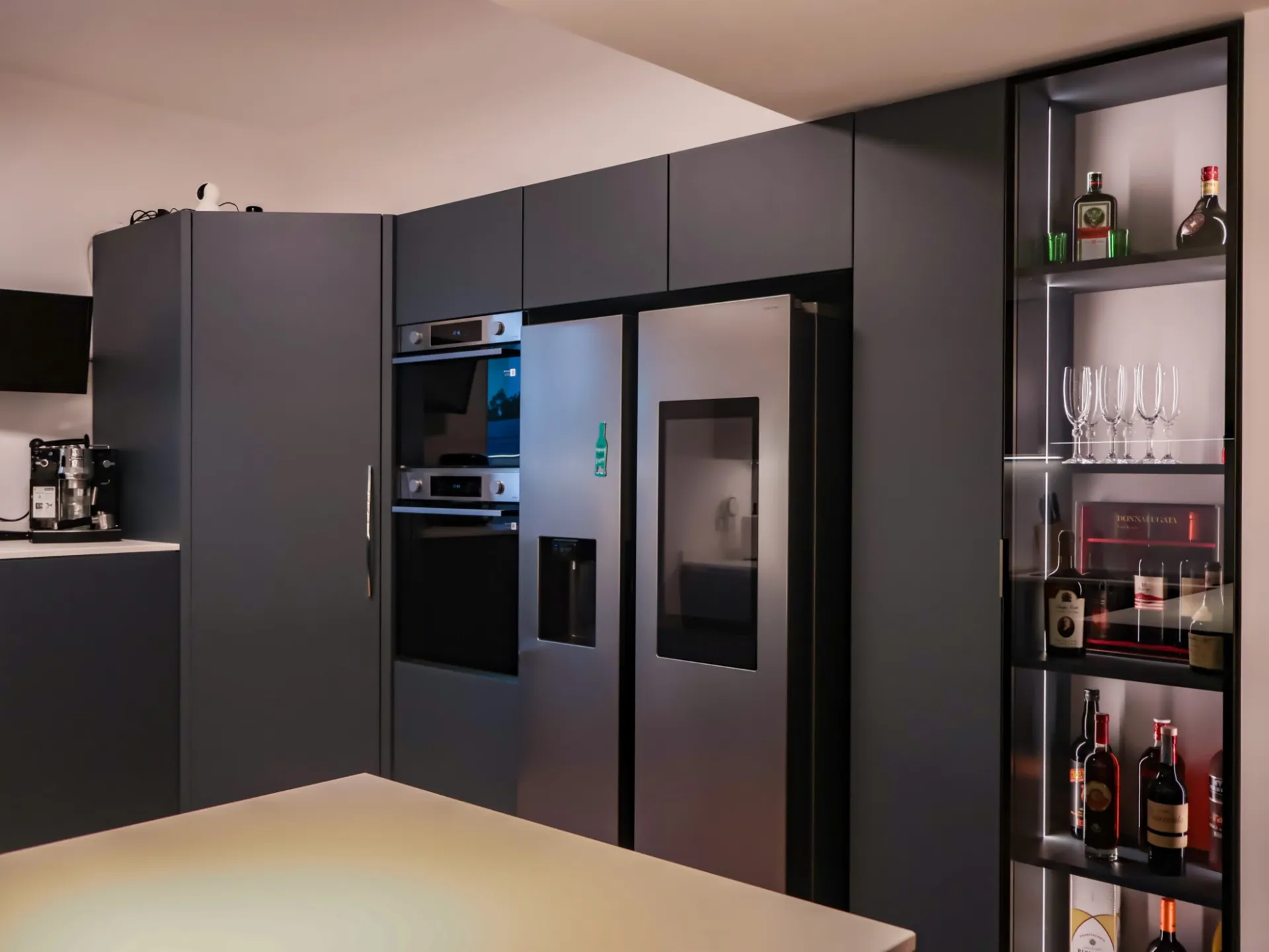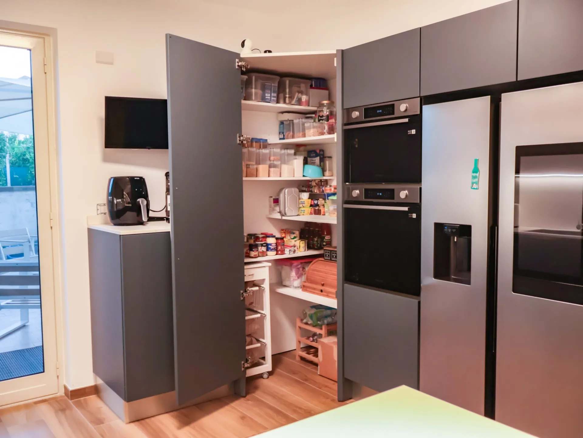 La colonna EsaSystem offre un’organizzazione impeccabile, integrando spazi contenitivi e funzioni tecniche in modo discreto e ordinato, mentre l’angolo attrezzato massimizza la praticità, rendendo ogni gesto in cucina fluido e confortevole.