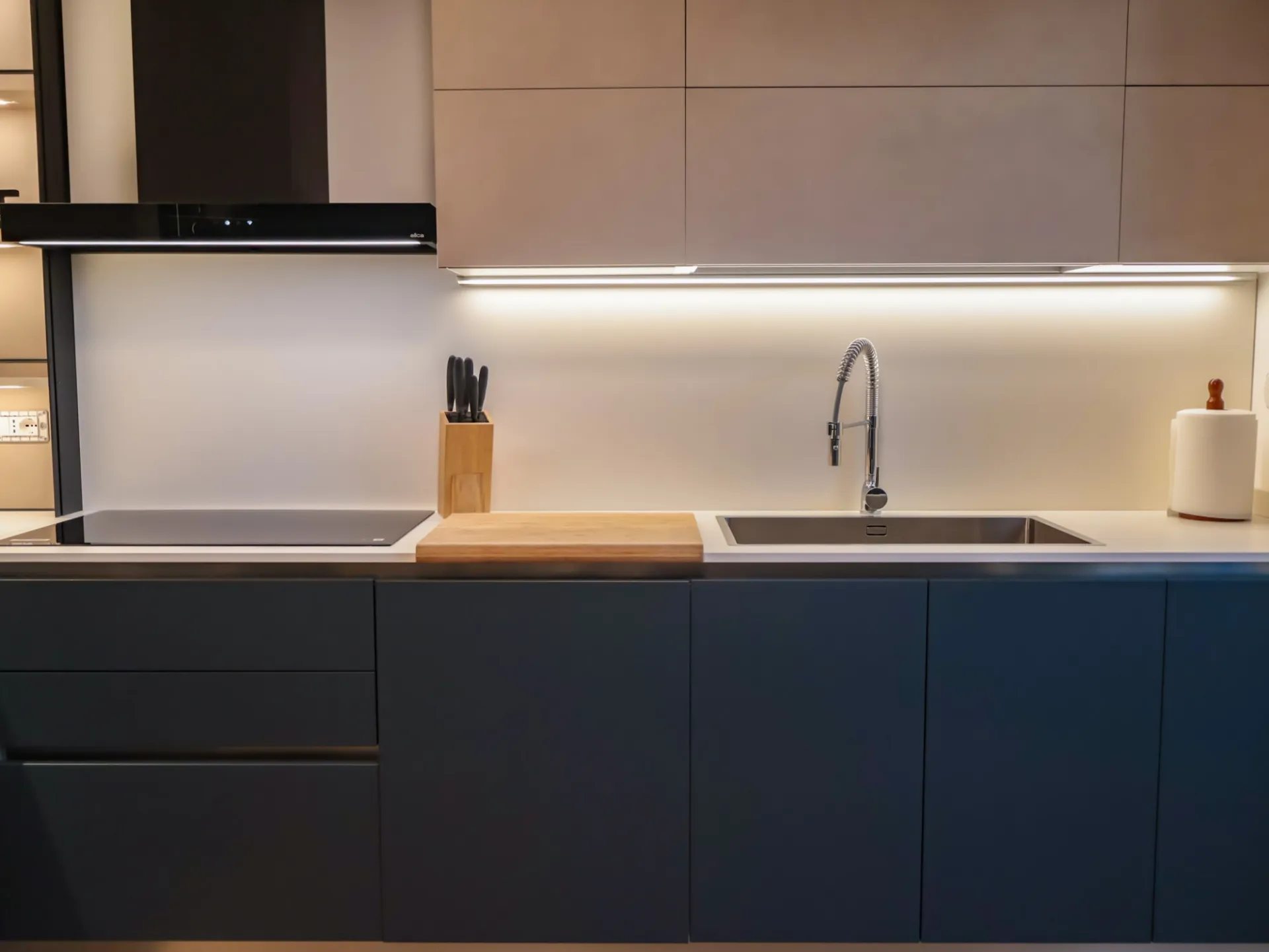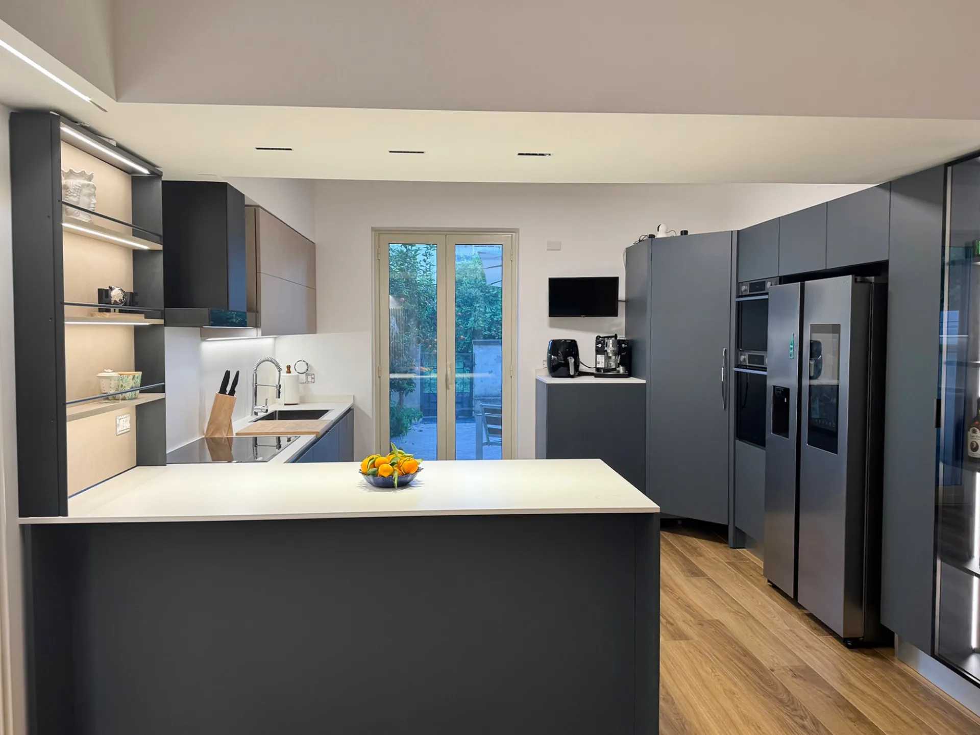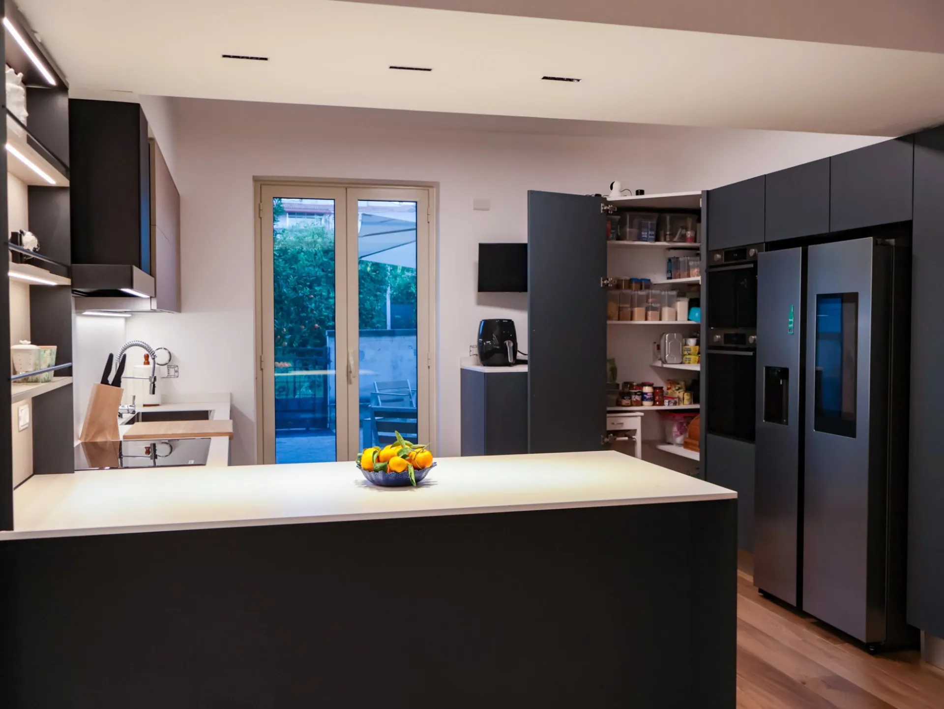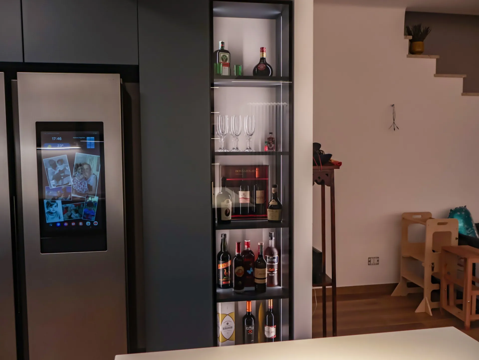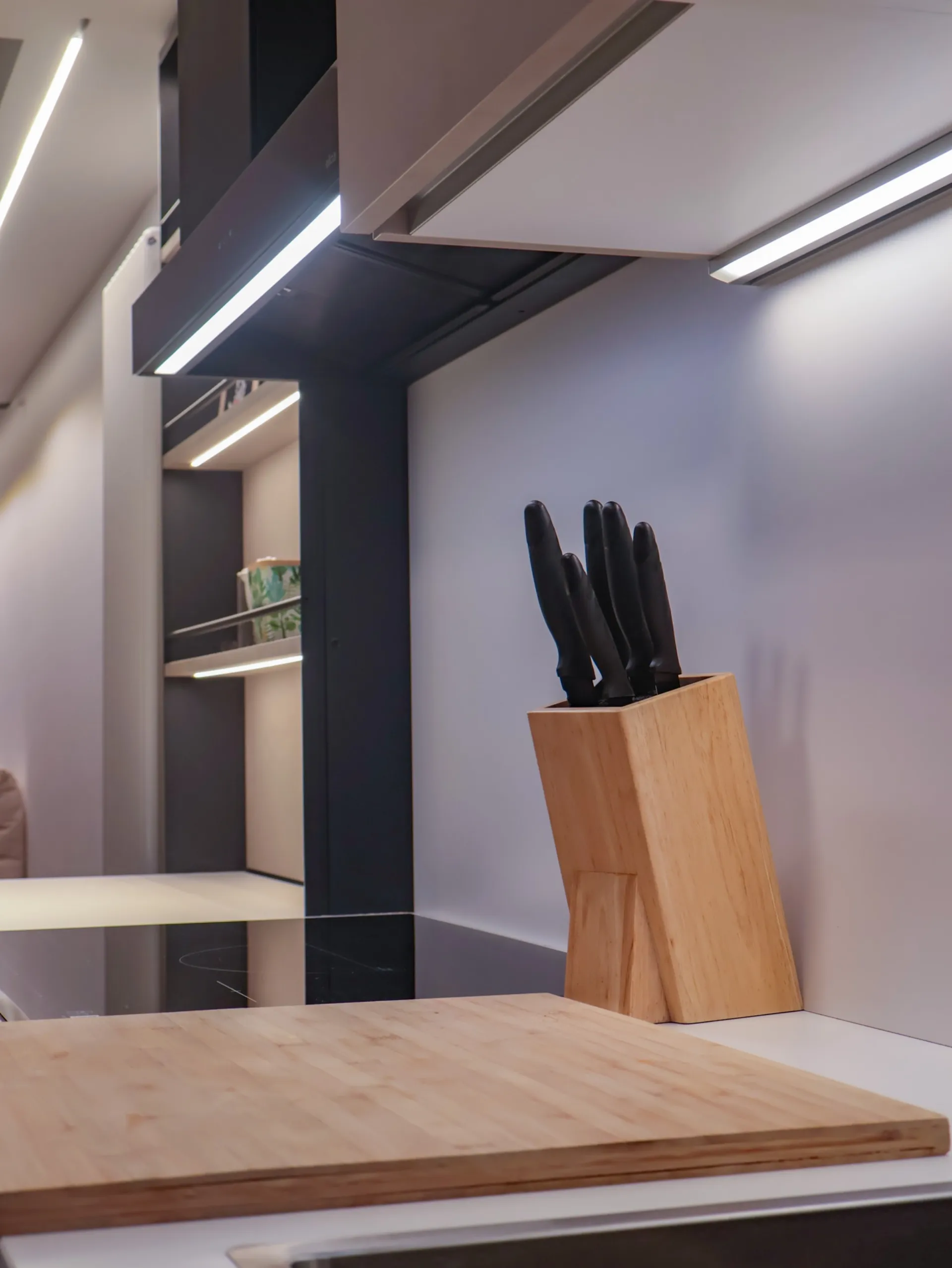 La colonna EsaSystem offre un’organizzazione impeccabile, integrando spazi contenitivi e funzioni tecniche in modo discreto e ordinato, mentre l’angolo attrezzato massimizza la praticità, rendendo ogni gesto in cucina fluido e confortevole.