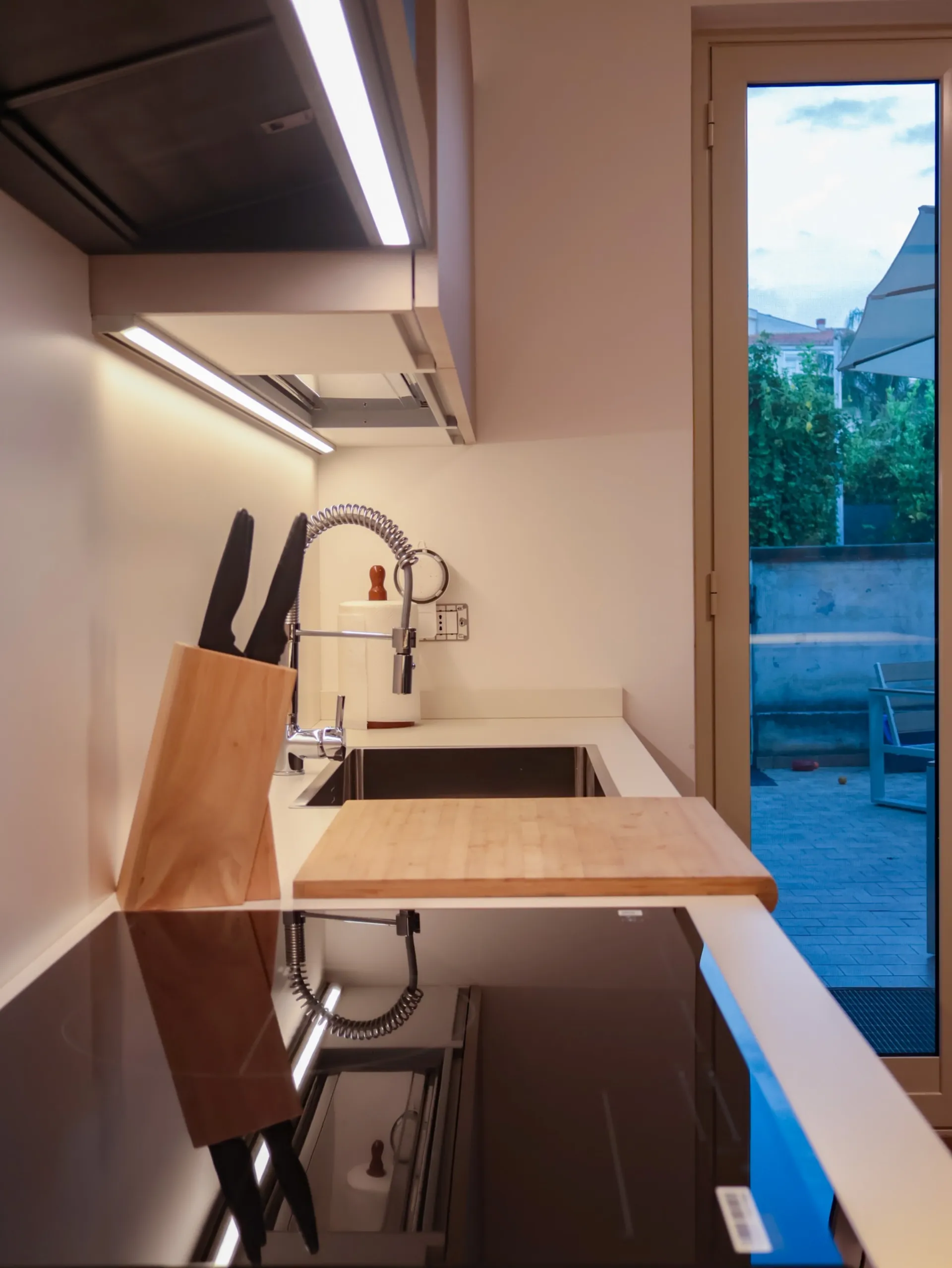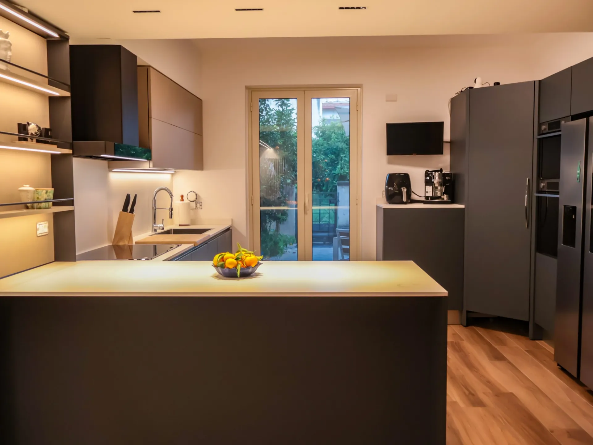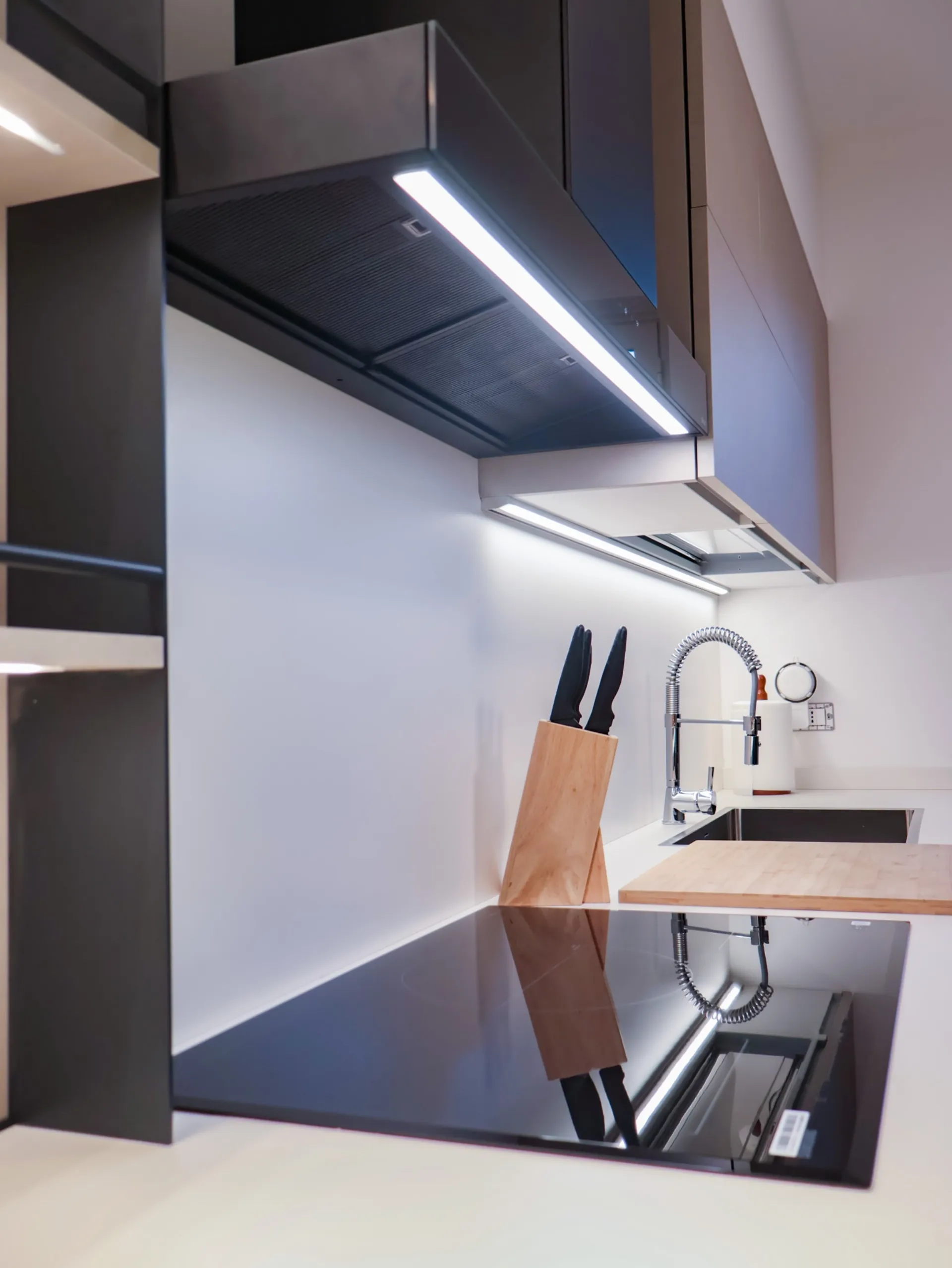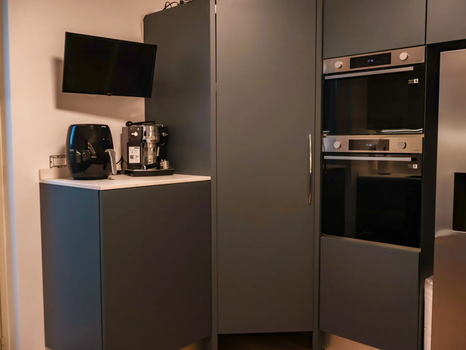 La colonna EsaSystem offre un’organizzazione impeccabile, integrando spazi contenitivi e funzioni tecniche in modo discreto e ordinato, mentre l’angolo attrezzato massimizza la praticità, rendendo ogni gesto in cucina fluido e confortevole.