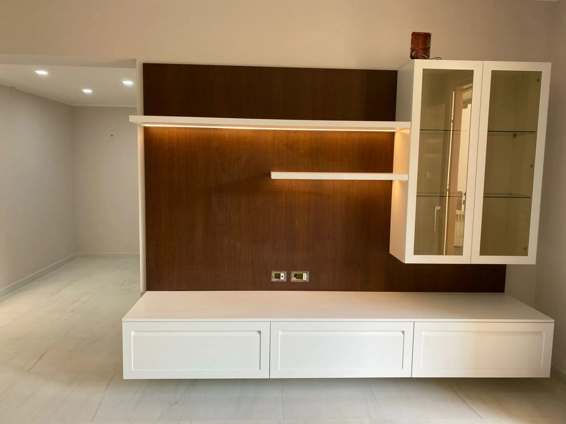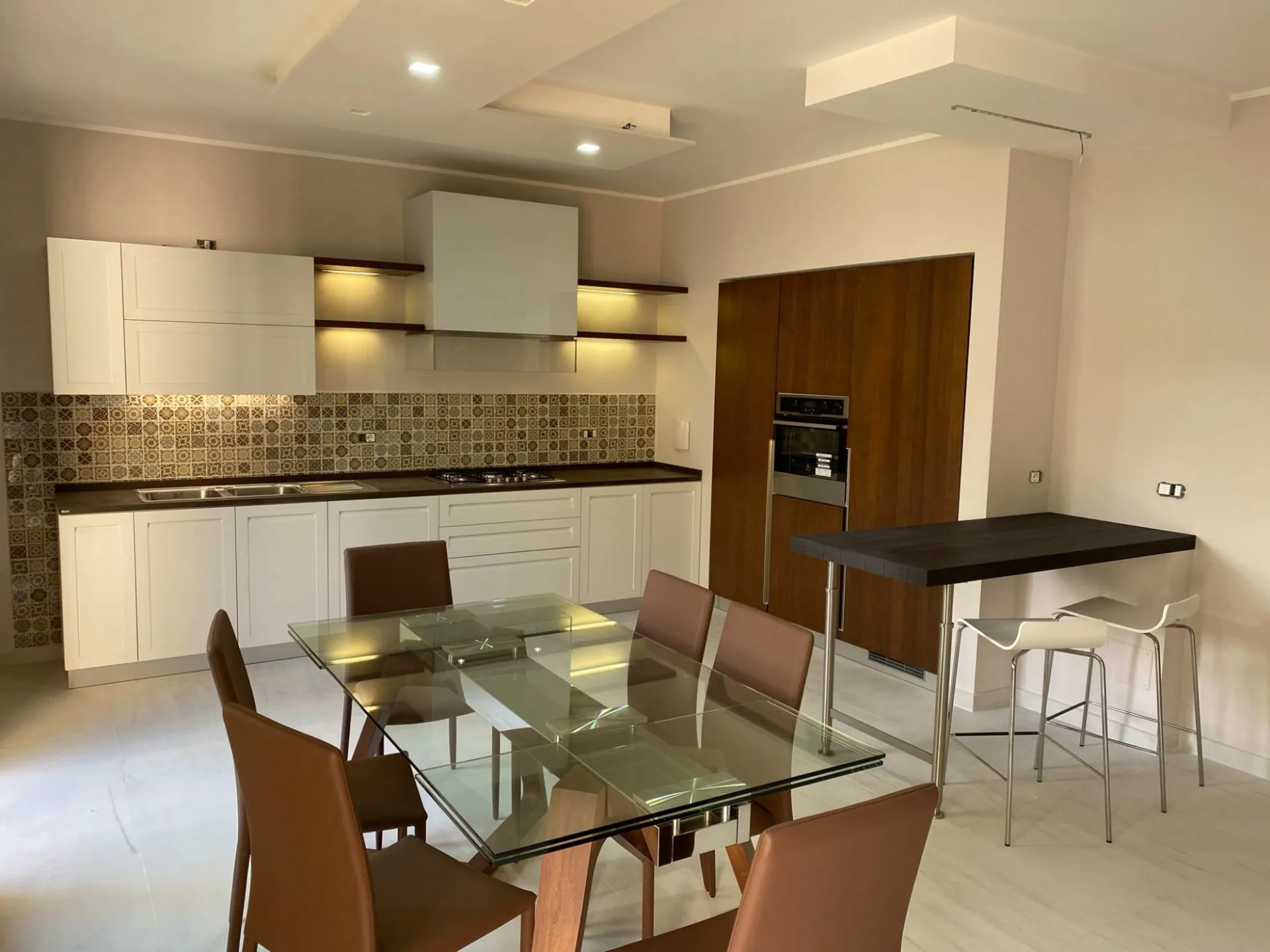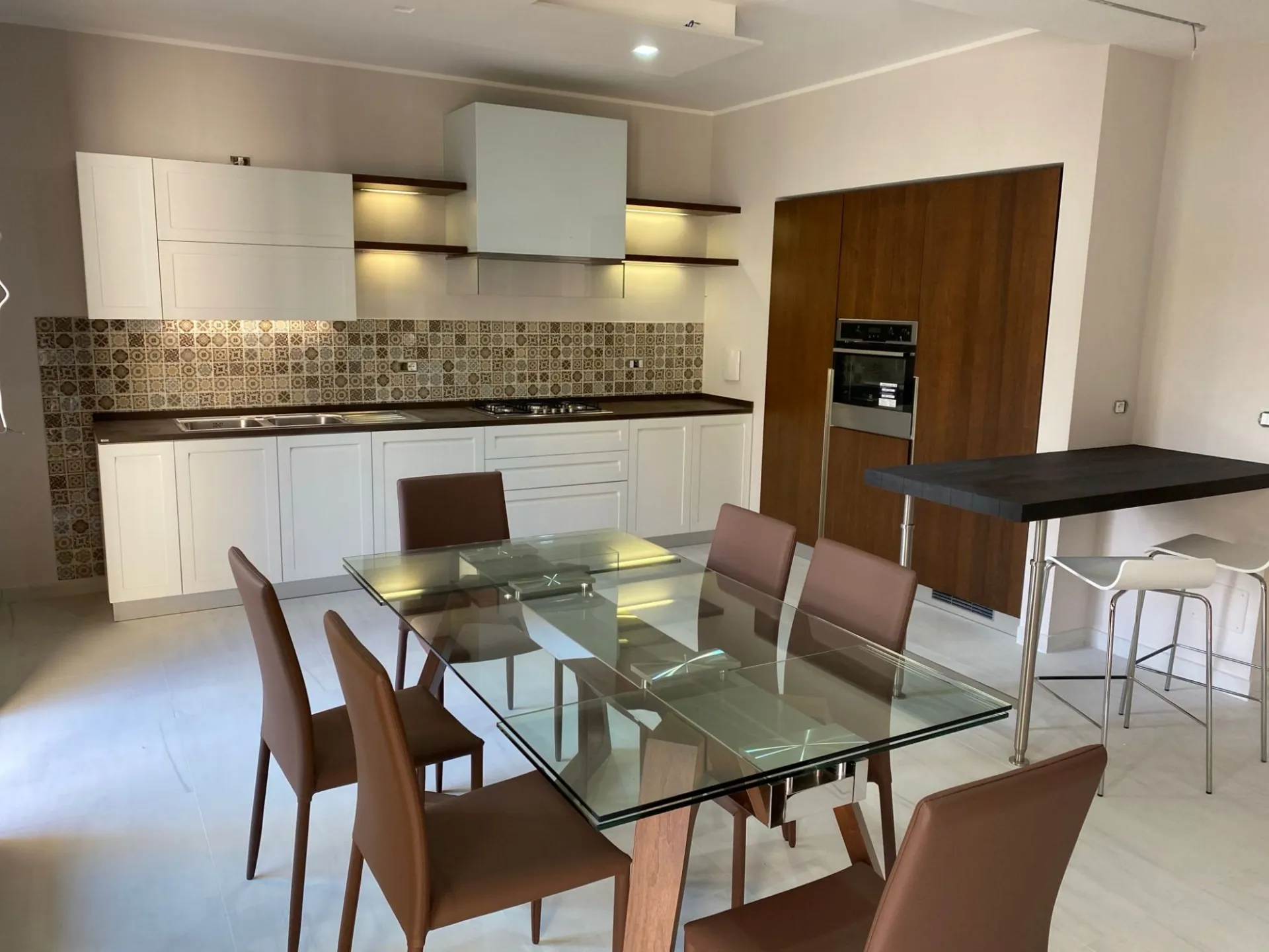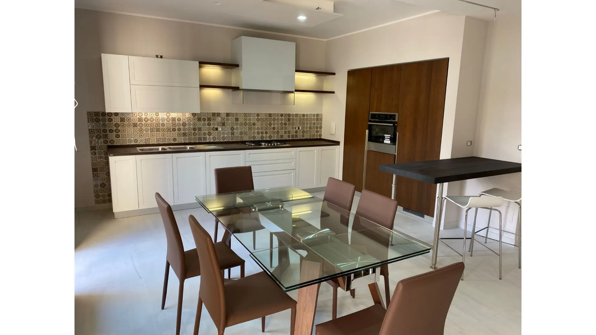 Le mensole con illuminazione LED integrata diventano un segno distintivo del progetto: la luce valorizza i materiali, crea atmosfera e accompagna i momenti della giornata. La cappa in vetro, leggera e discreta, si inserisce con naturalezza, mantenendo pulizia visiva e continuità stilistica.