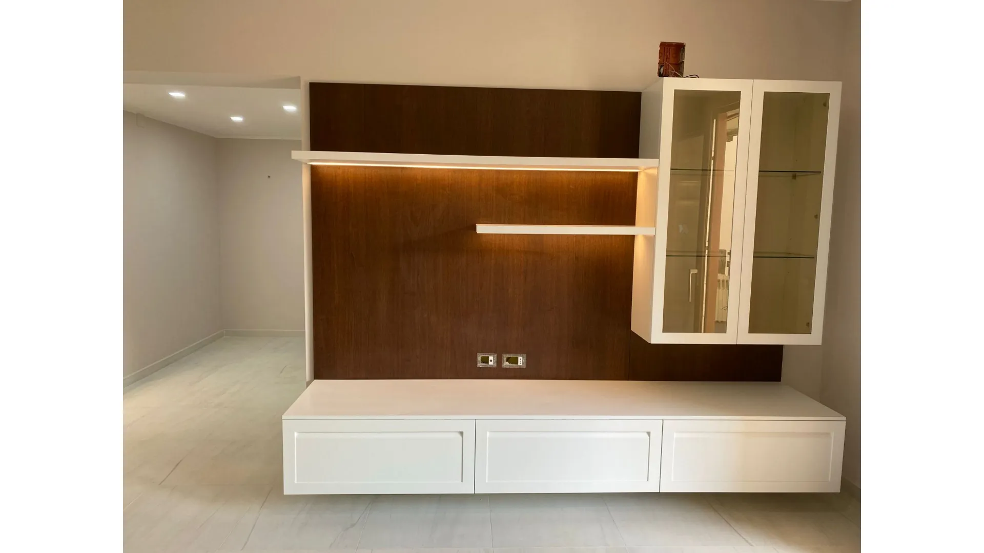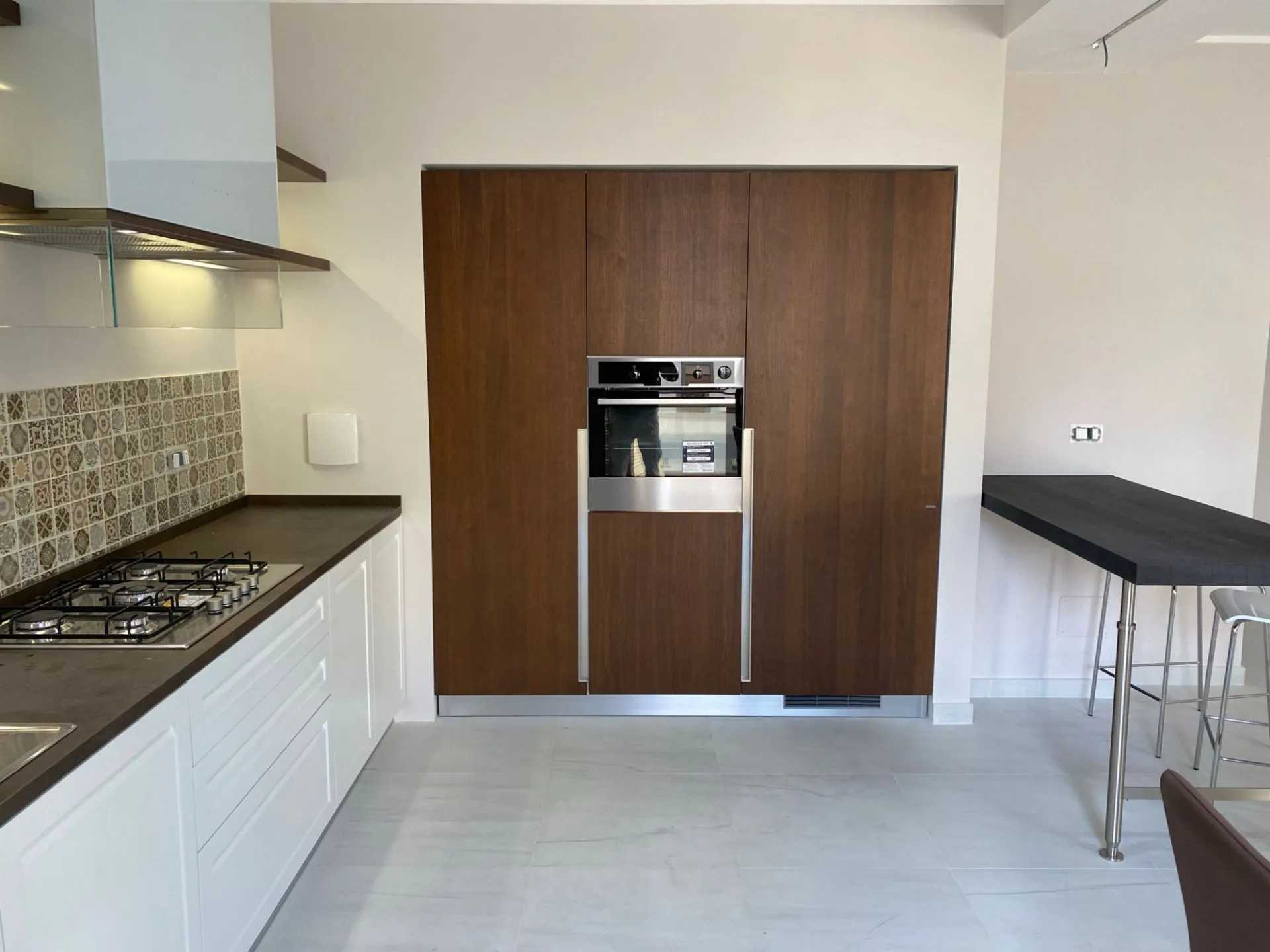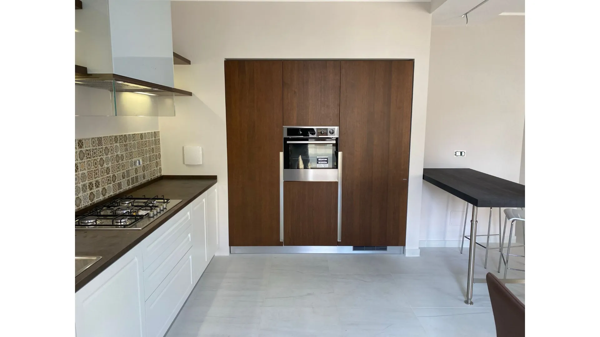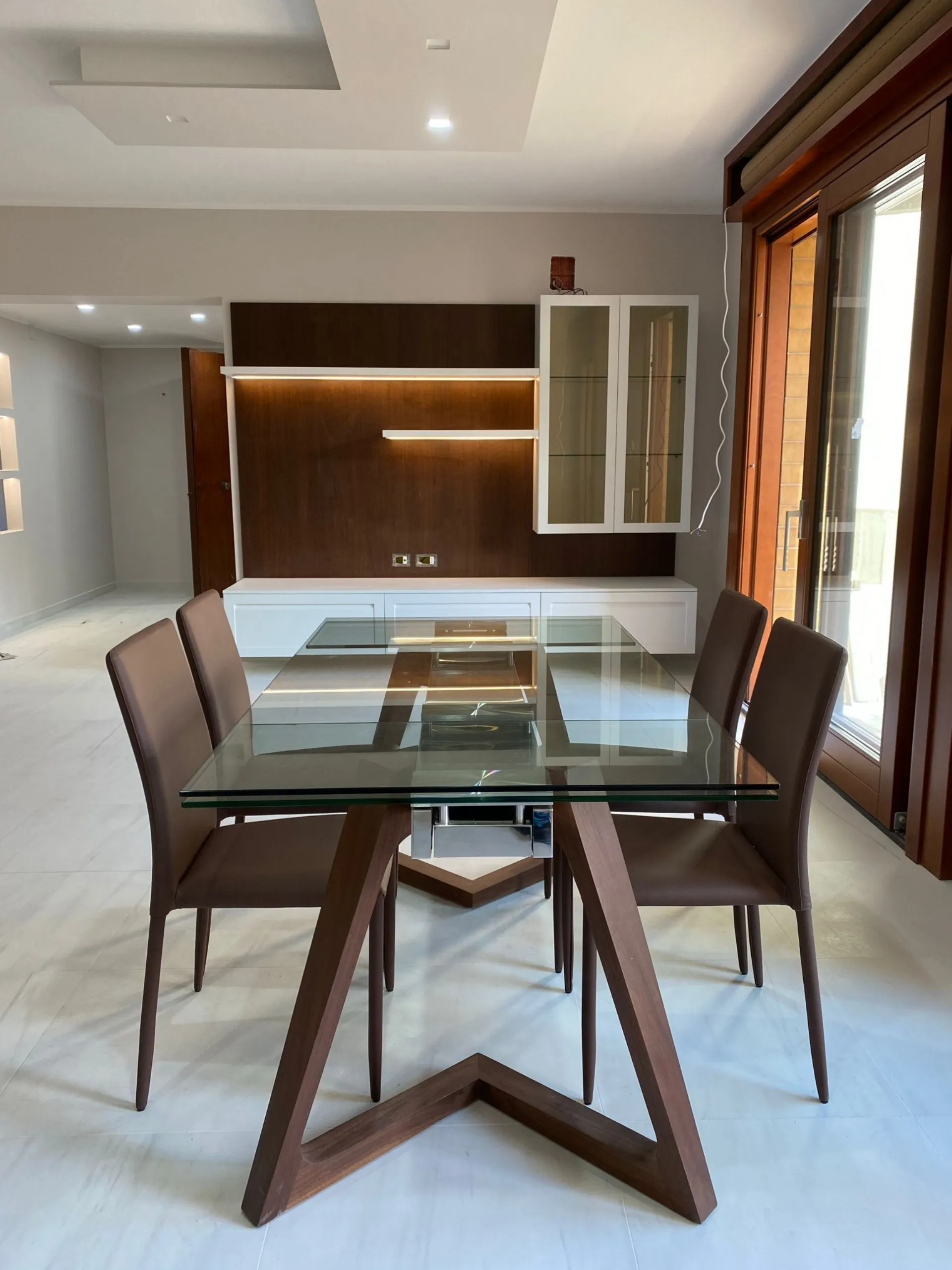 Il laccato bianco opaco illumina lo spazio con eleganza, mentre il noce canaletto aggiunge profondità e calore, creando un equilibrio perfetto tra rigore contemporaneo e sensazione di casa. Un contrasto raffinato che dona carattere senza appesantire l’ambiente.