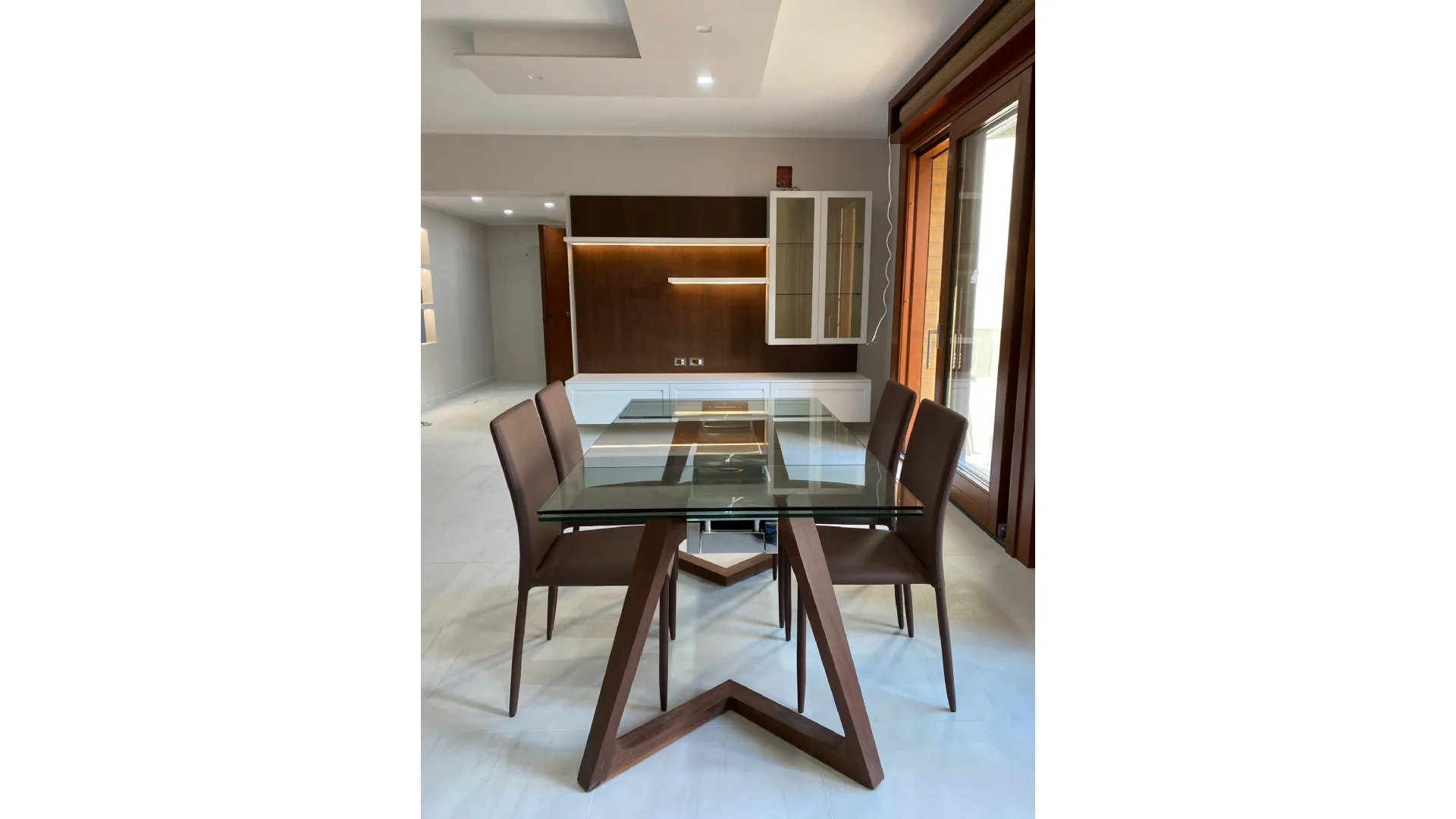 La continuità con il living rende lo spazio fluido e conviviale, ideale per accogliere e condividere. A completare l’ambiente, il tavolo Enea di Di Lazzaro introduce un tocco di design leggero ed elegante, diventando il fulcro della zona pranzo.