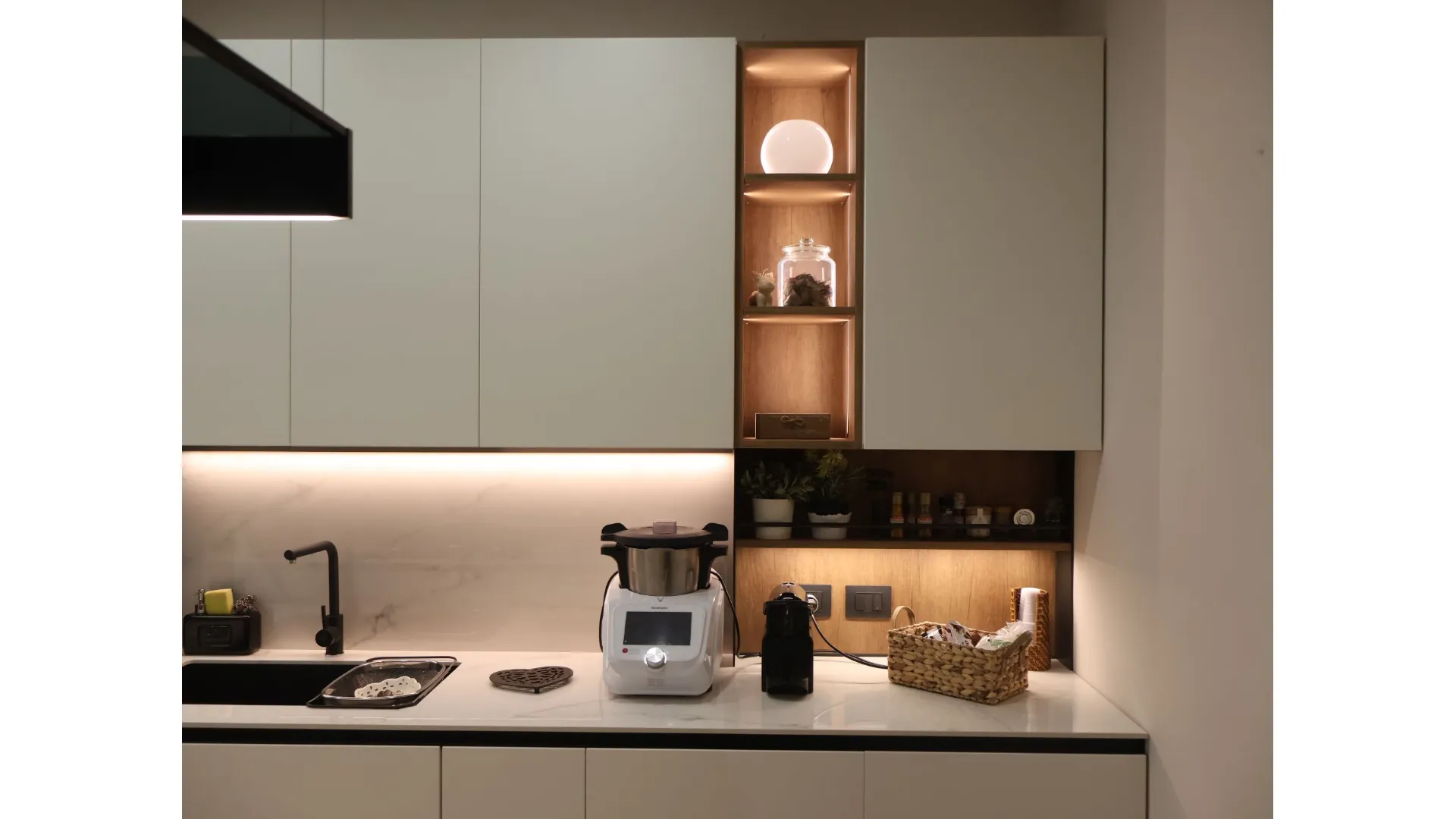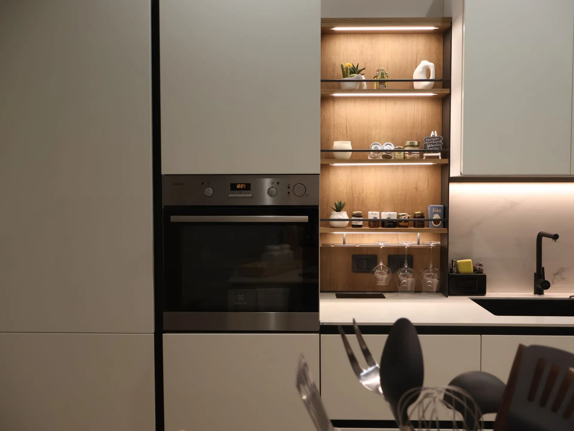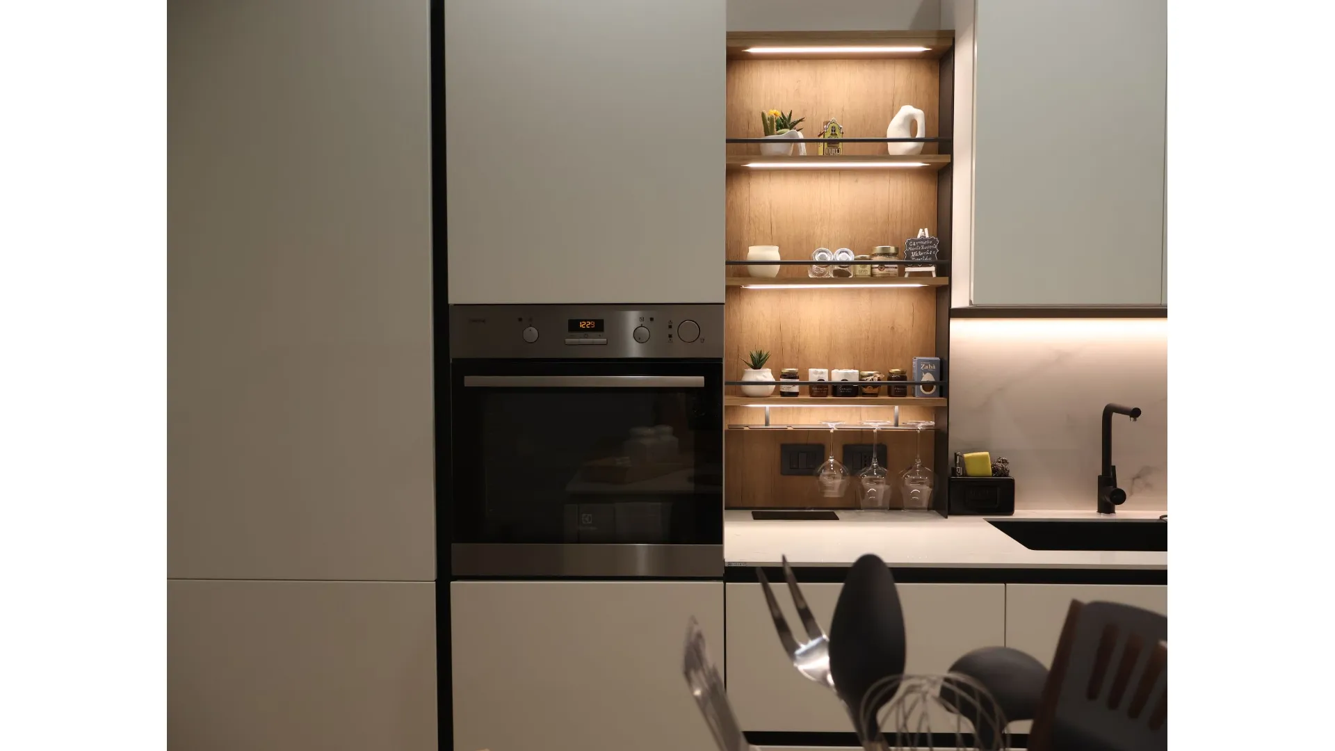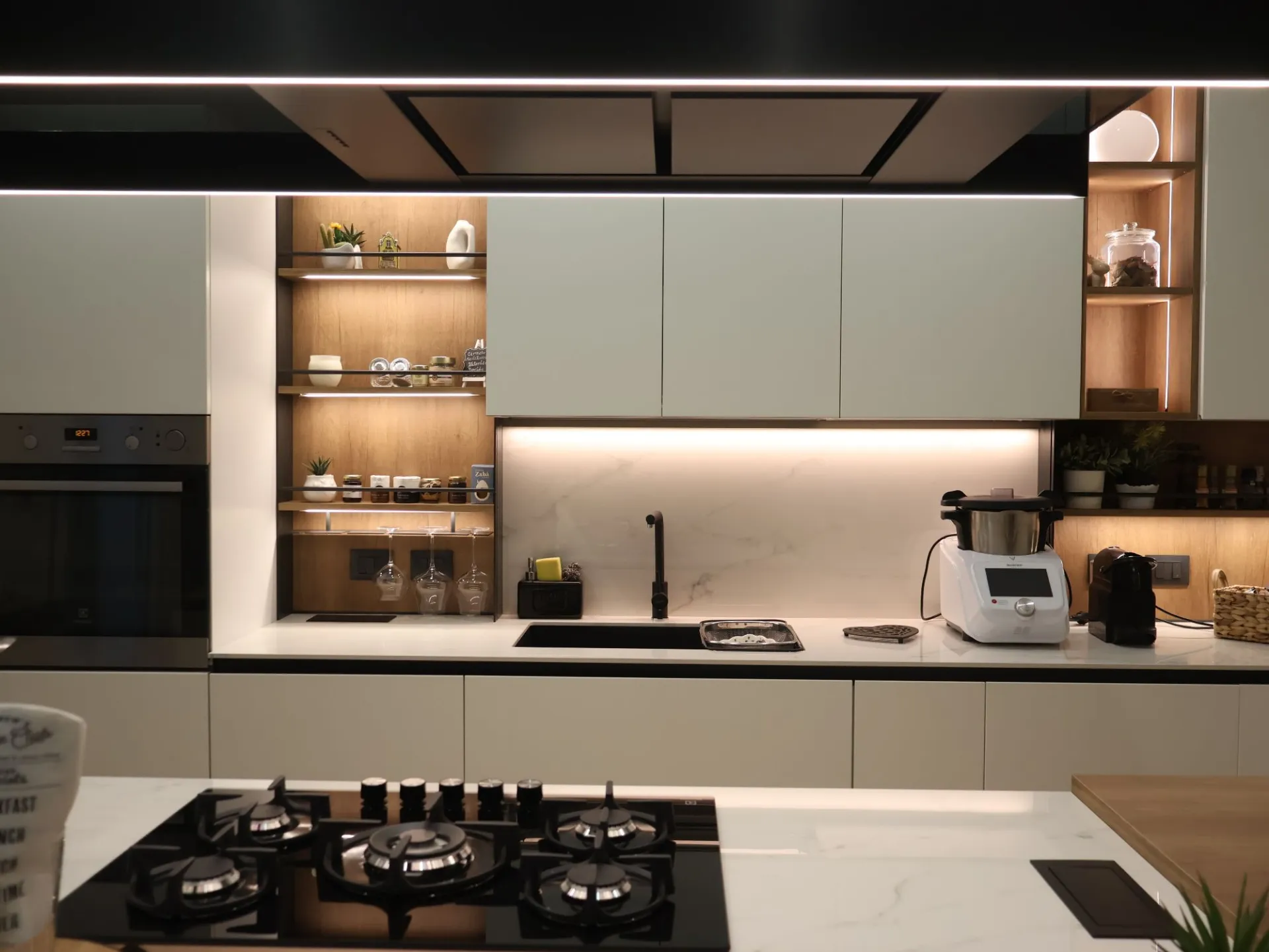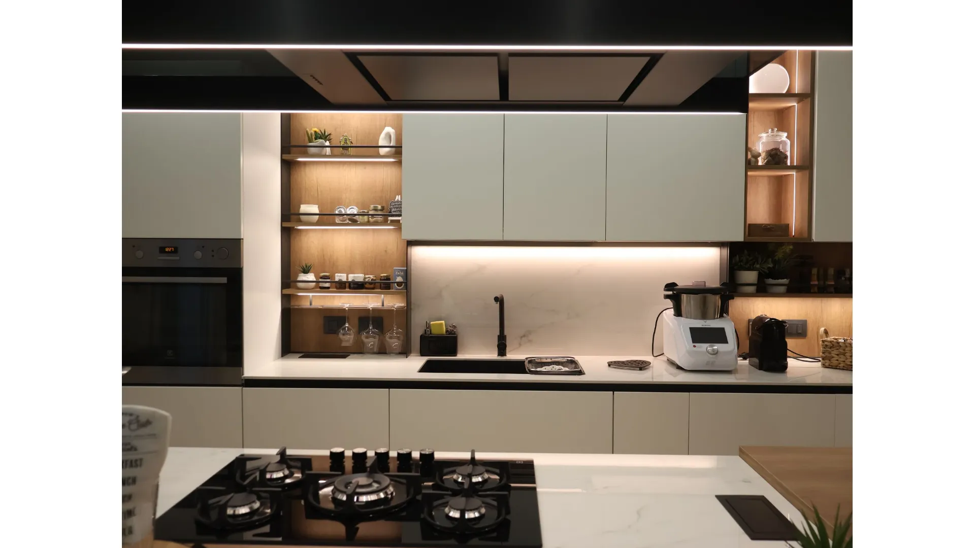 L’illuminazione LED integrata, studiata per esaltare ogni dettaglio, accompagna i volumi e le superfici, trasformando la cucina in uno spazio emozionale oltre che funzionale.