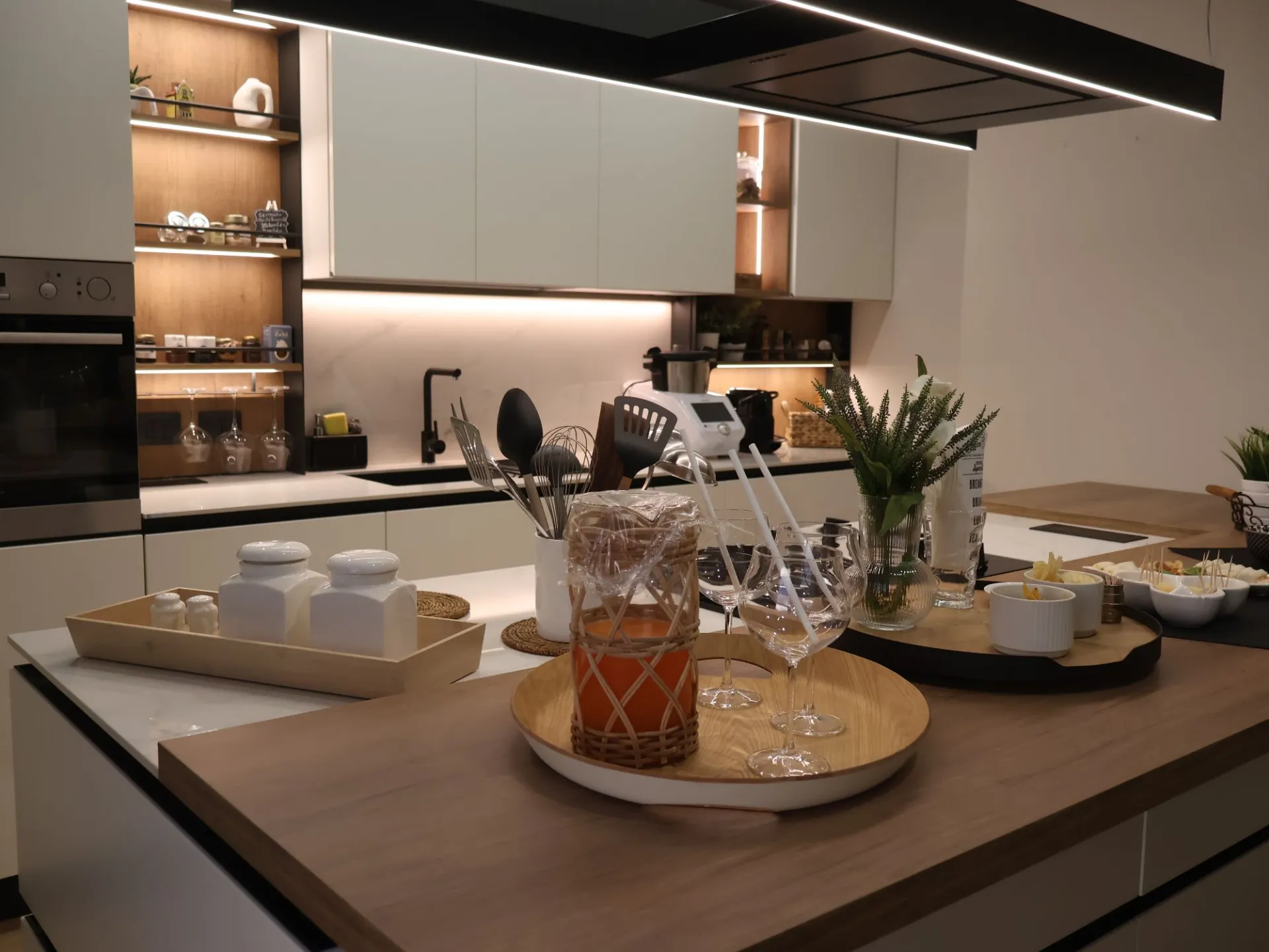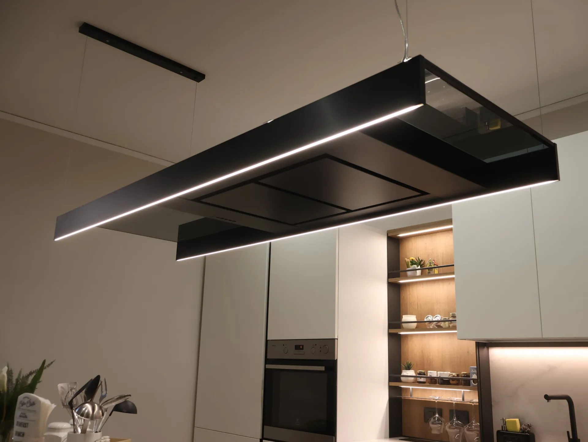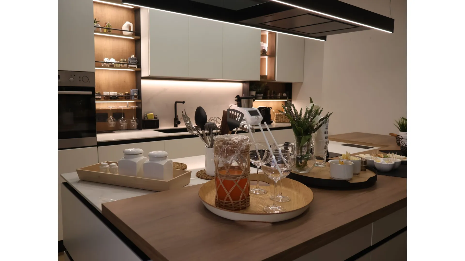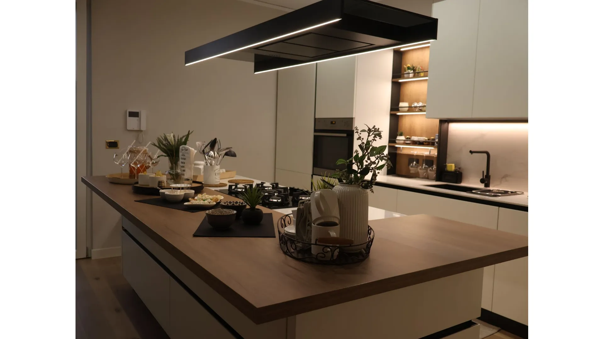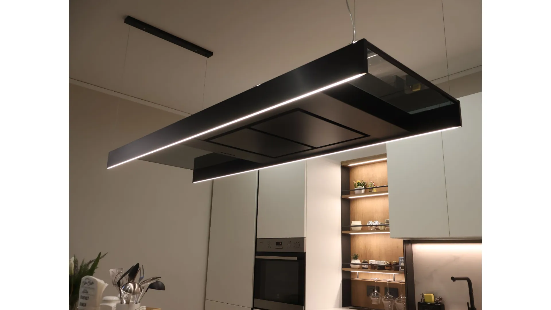 L’illuminazione LED integrata, studiata per esaltare ogni dettaglio, accompagna i volumi e le superfici, trasformando la cucina in uno spazio emozionale oltre che funzionale.