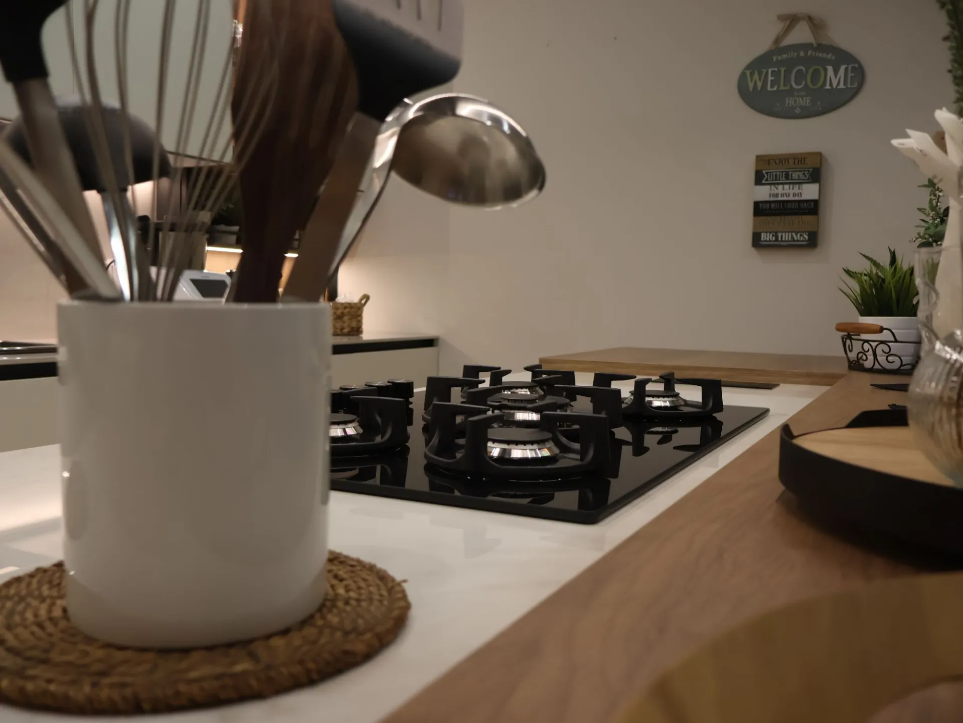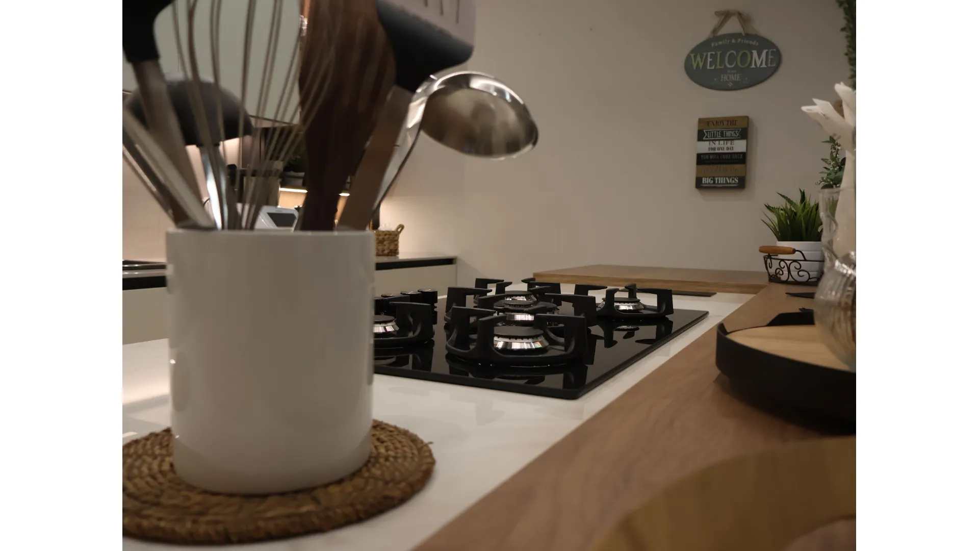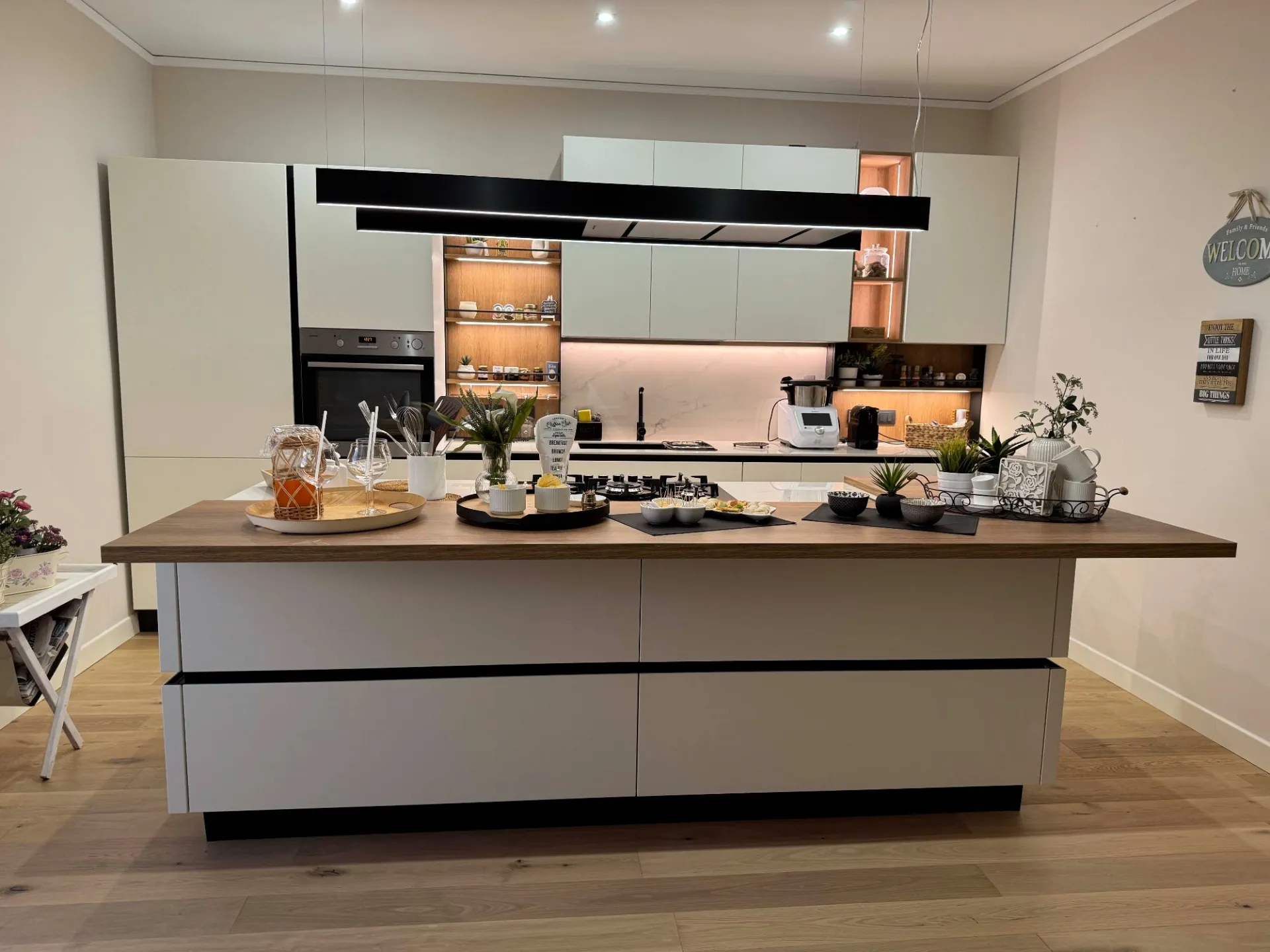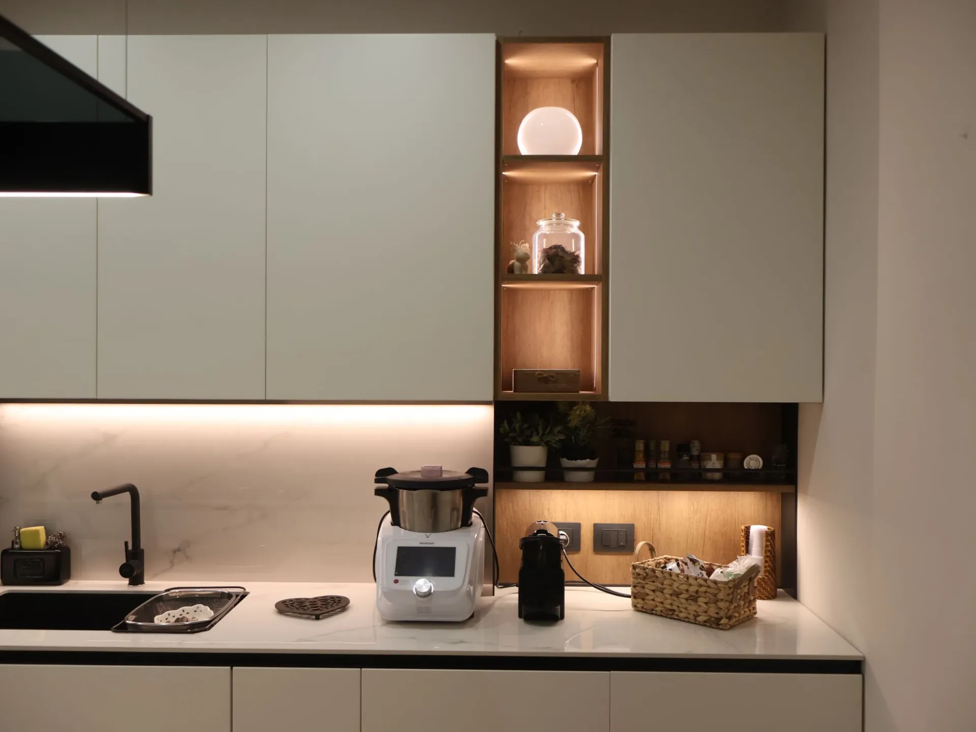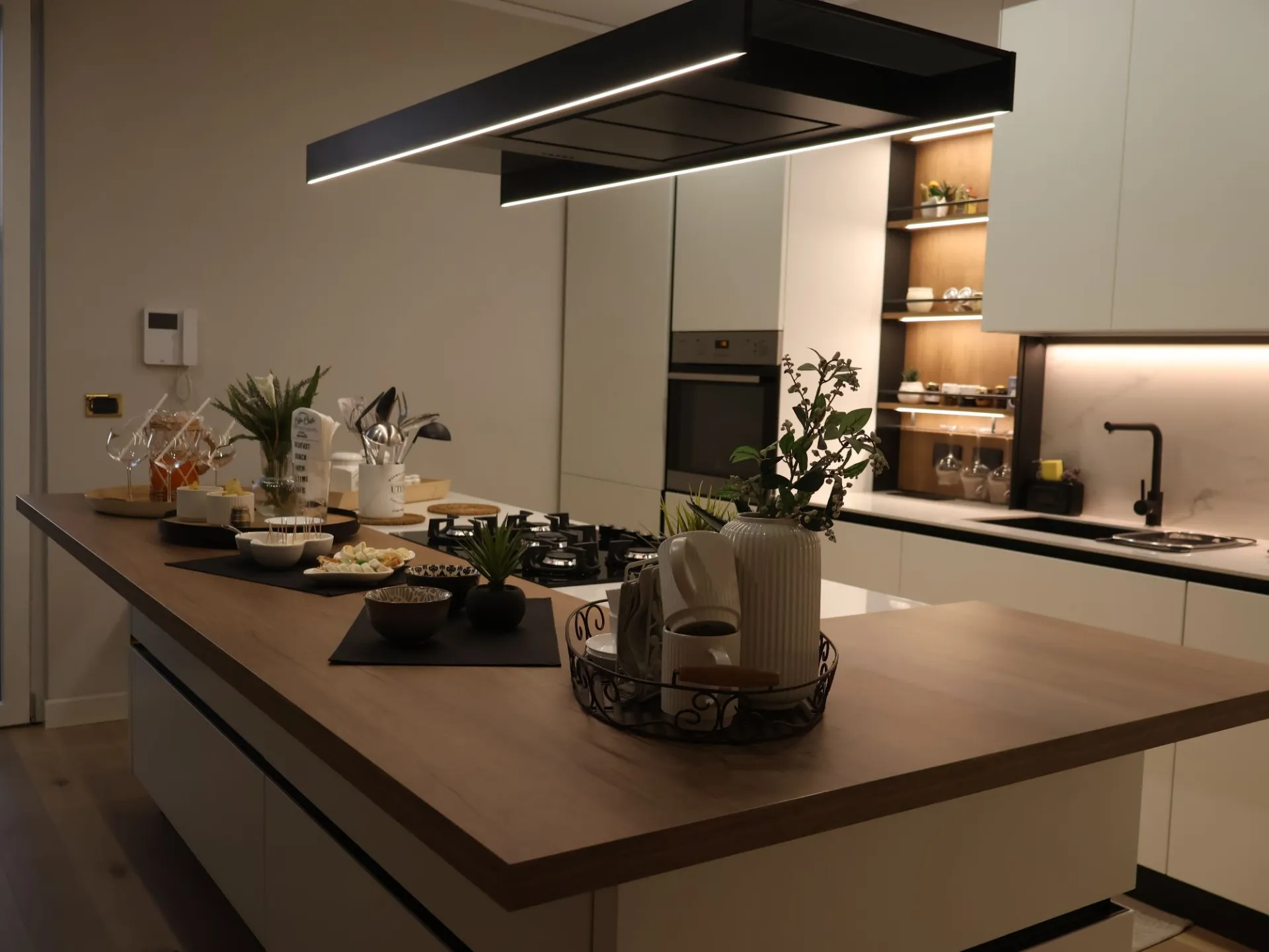 L’illuminazione LED integrata, studiata per esaltare ogni dettaglio, accompagna i volumi e le superfici, trasformando la cucina in uno spazio emozionale oltre che funzionale.