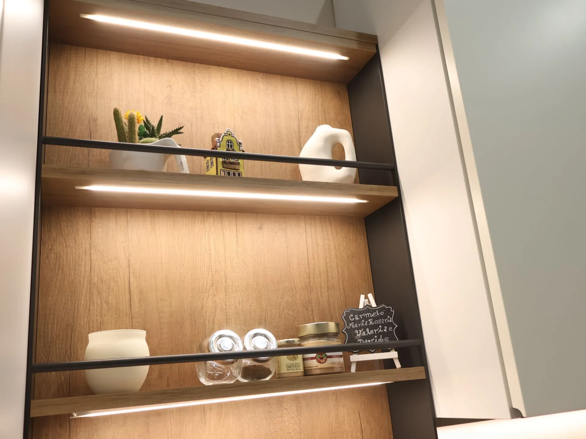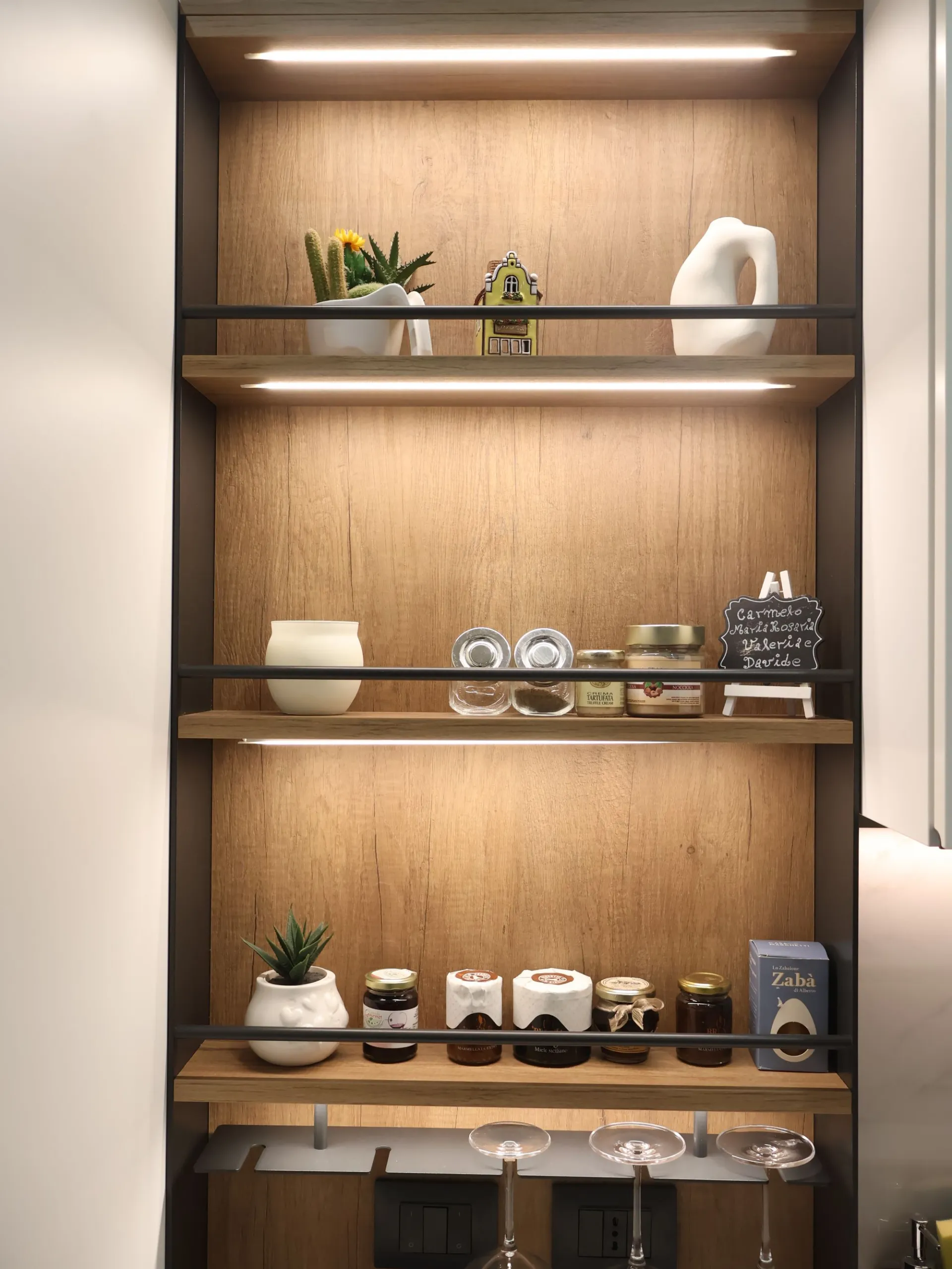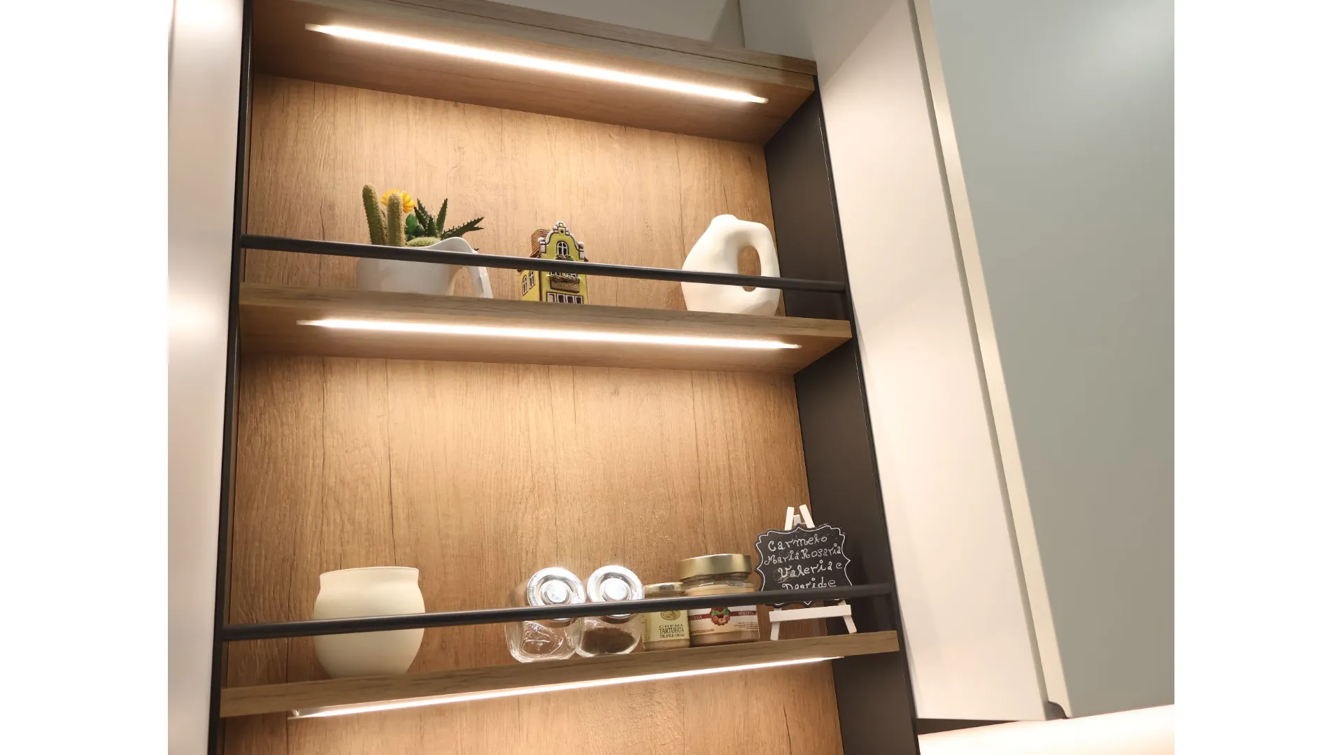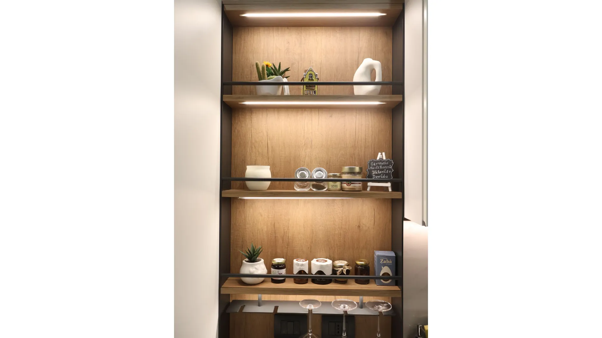 I pensili a giorno e il sistema StepSystem attrezzato alleggeriscono visivamente la composizione, introducendo spazi dinamici e funzionali. Le nicchie illuminate diventano elementi scenografici che valorizzano oggetti e materiali, contribuendo a creare un’atmosfera sofisticata e accogliente.