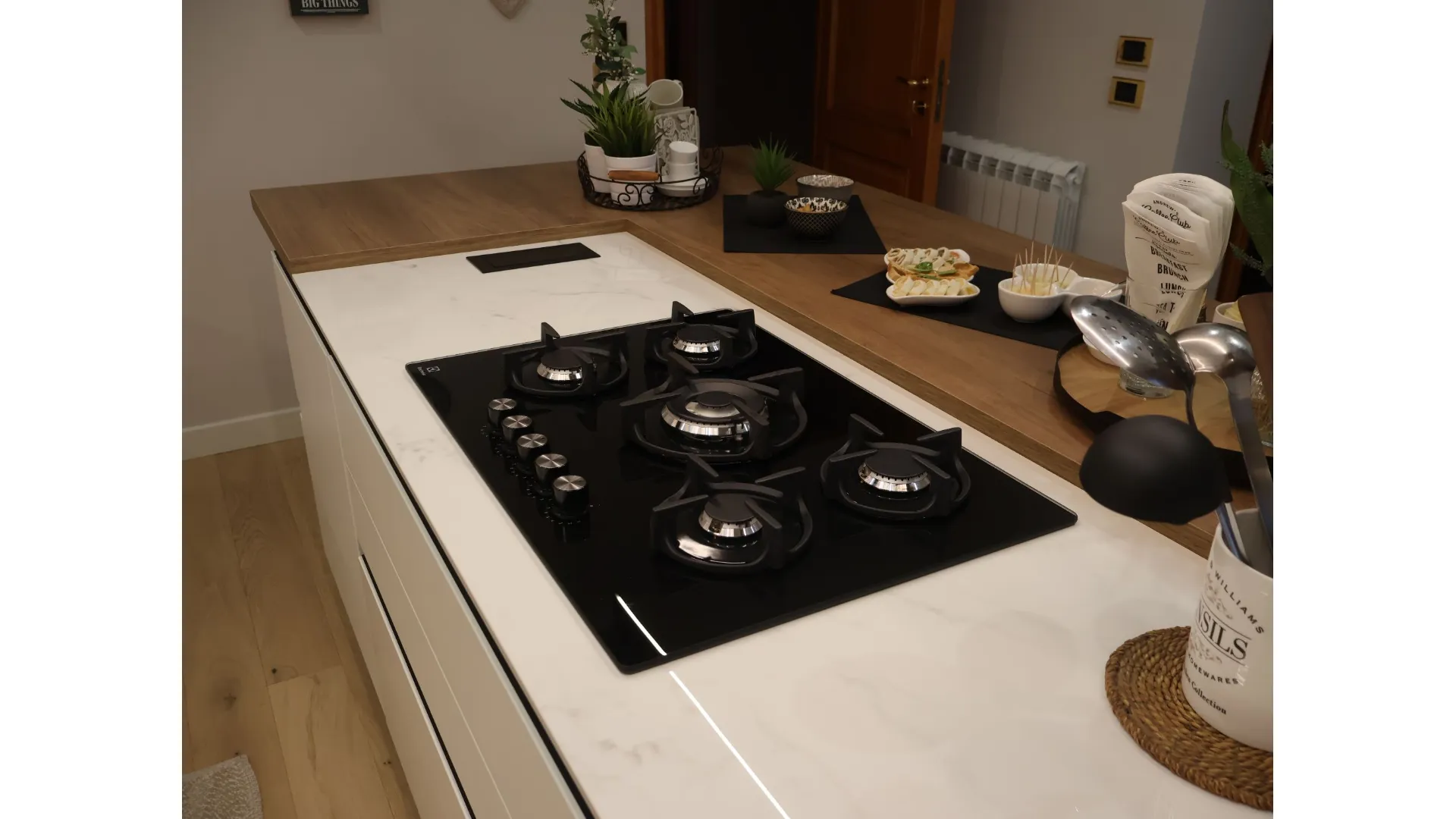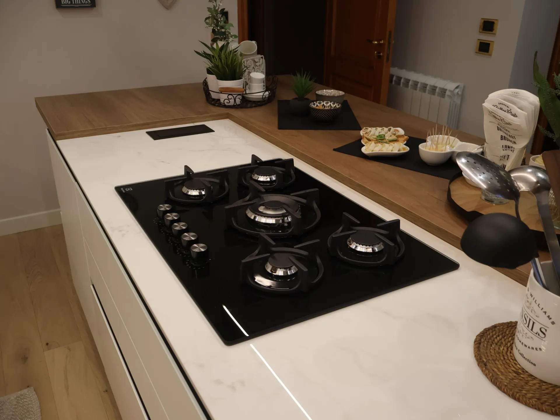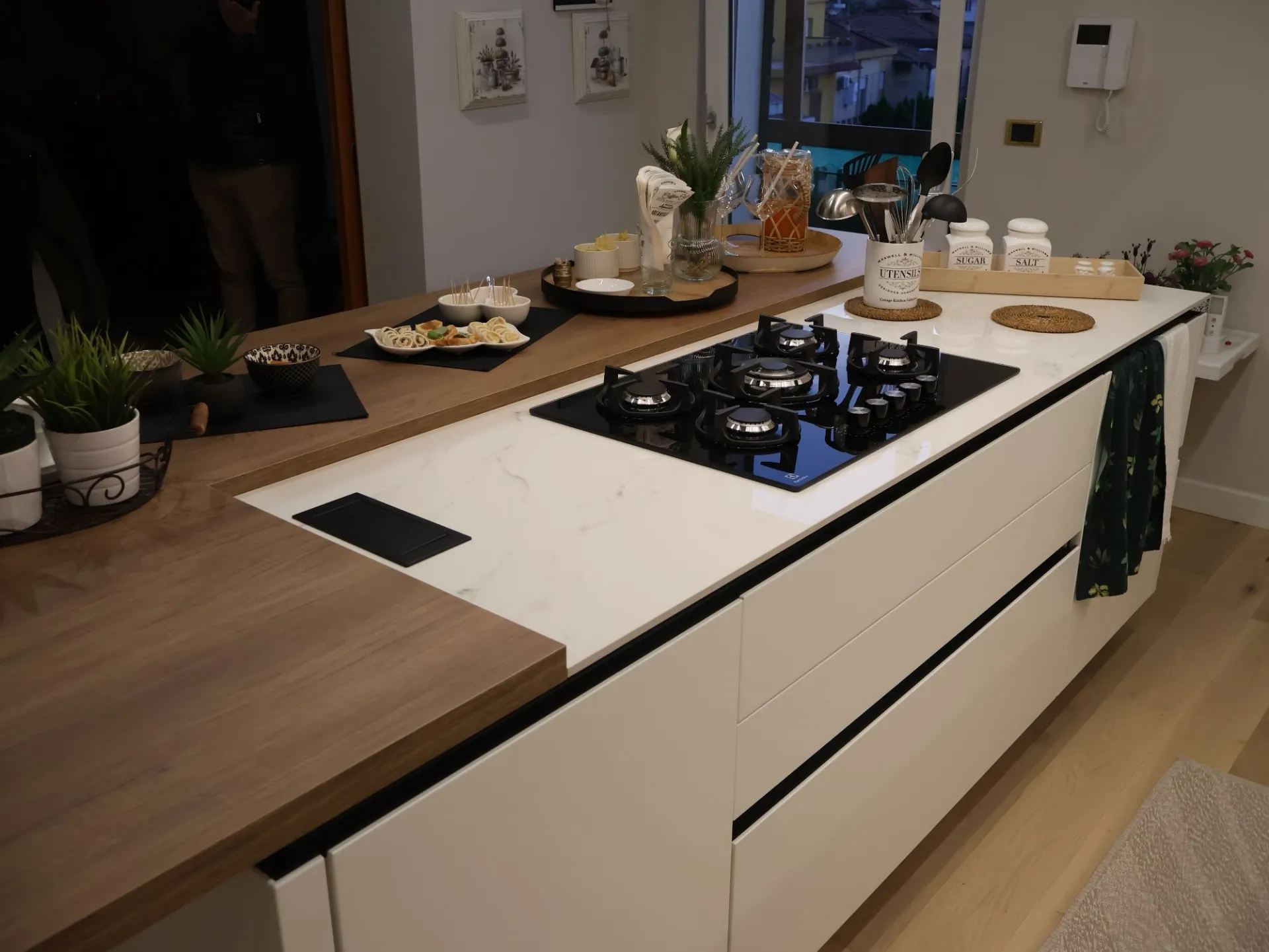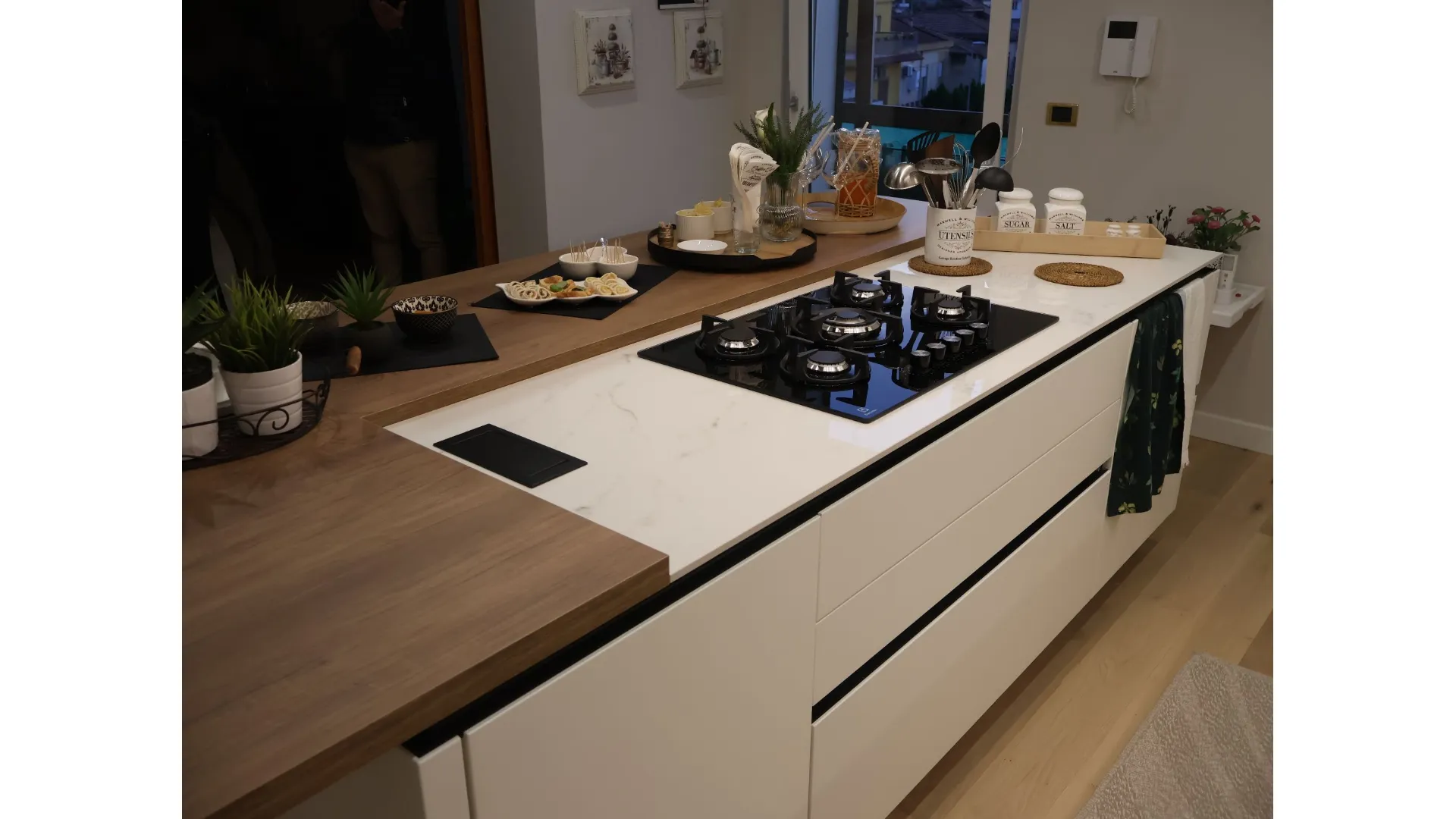 Protagonista assoluta è l’isola centrale, concepita come fulcro della cucina e luogo di incontro. Il piano cottura integrato dialoga con il piano snack in Leccio Cognac, una finitura calda e materica che aggiunge un tocco di naturale eleganza, creando un equilibrio perfetto tra convivialità e funzionalità.