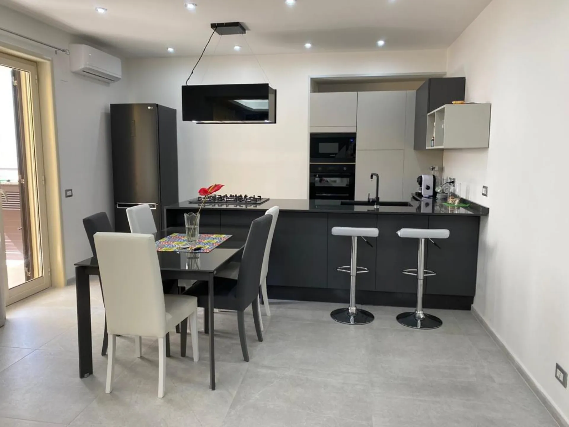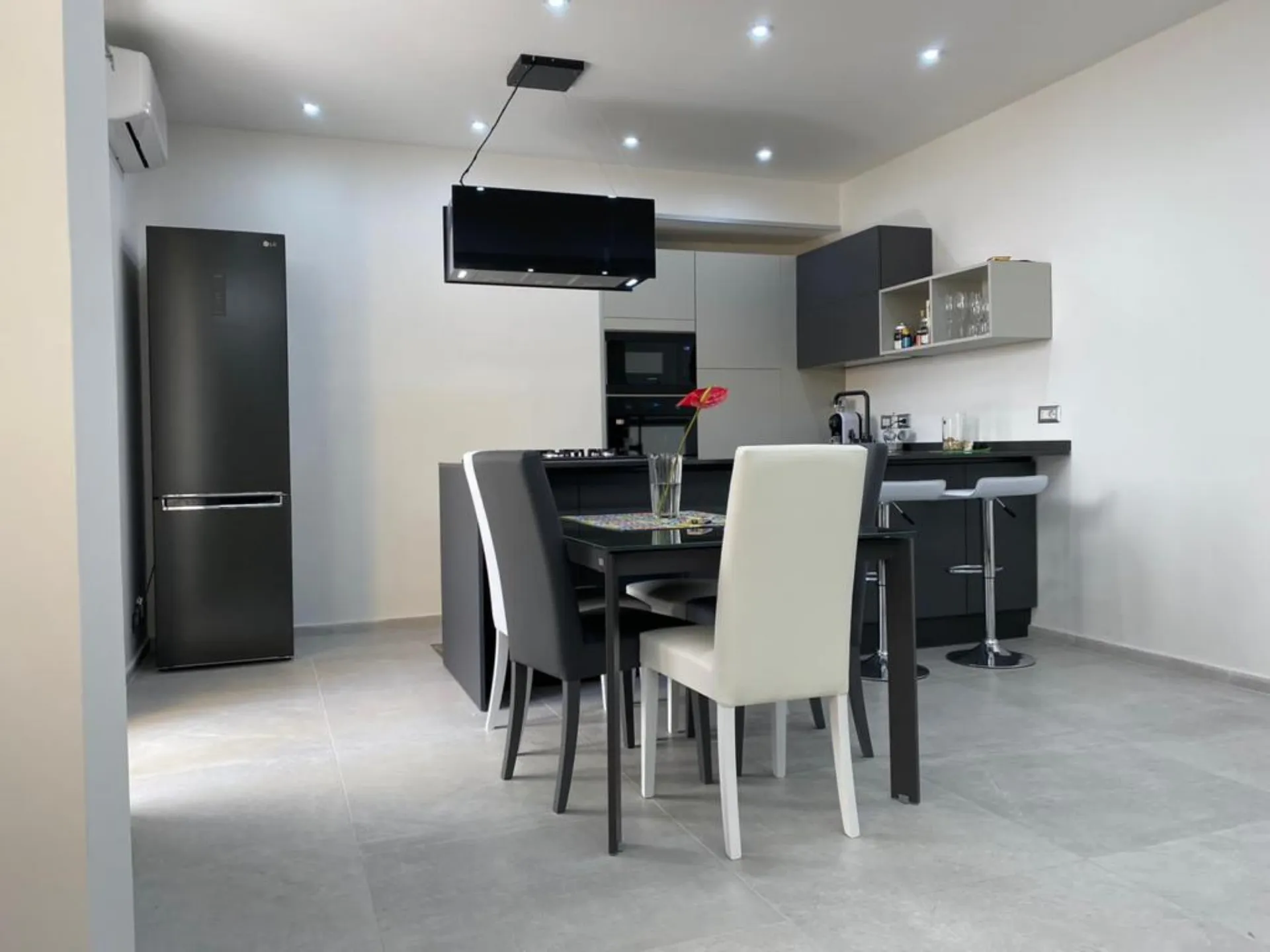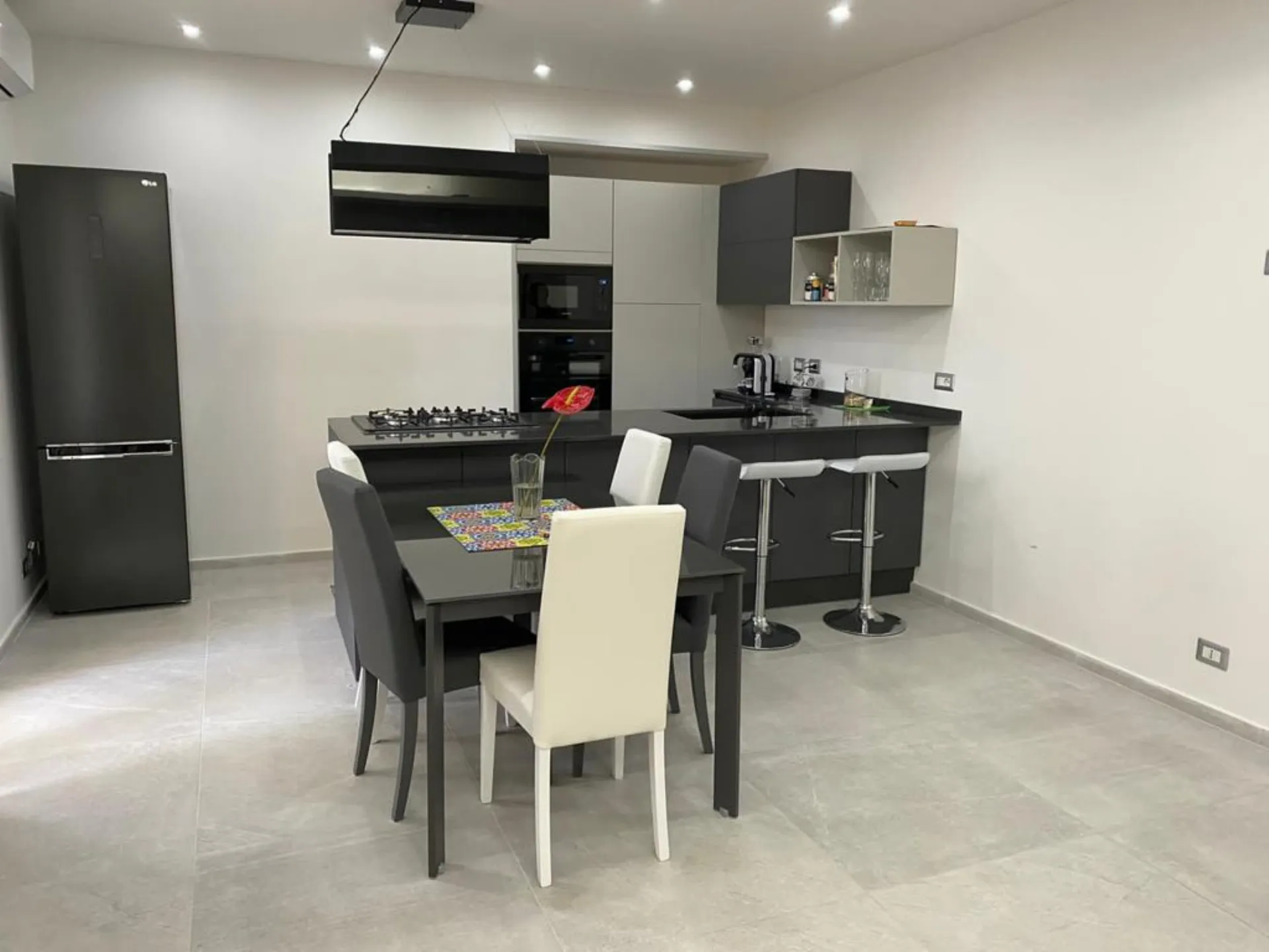 Una cucina moderna con isola in nero e pensili grigi offre un design elegante e contemporaneo. L’isola nera, centrata nello spazio, diventa il fulcro dell’ambiente, offrendo un’area di lavoro aggiuntiva e uno spazio per socializzare.