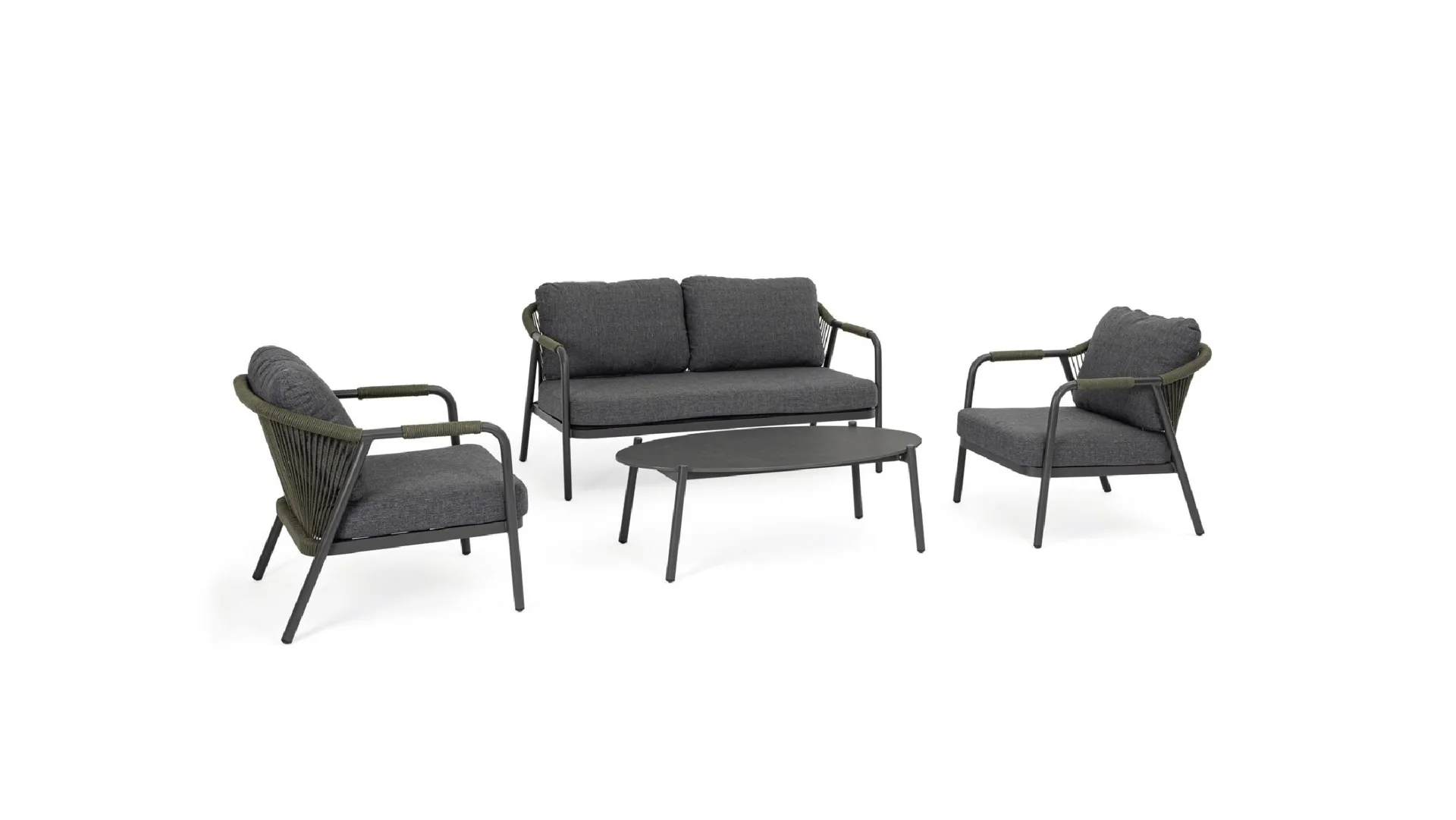 Il set salotto SET4 SALOTTO C-C MIRAVET ANT/VERDE di Bizzotto è una proposta di arredo esterno che eccelle per la sua concezione tecnica. Il tavolino complementare presenta un piano in pietra sinterizzata con uno spessore di 11mm, materiale noto per la sua durezza e resilienza. La struttura portante è realizzata in alluminio verniciato a polvere di poliestere, un materiale selezionato per la sua intrinseca robustezza e l'elevata resistenza alla corrosione e agli agenti atmosferici. L'intreccio esterno è composto da corda Olefin in polipropilene, che garantisce una notevole durabilità e un'ottima tenuta estetica nel tempo. L'adozione di materiali di prima scelta è un pilastro fondamentale nella progettazione di questo arredo, assicurando prestazioni e durata superiori.